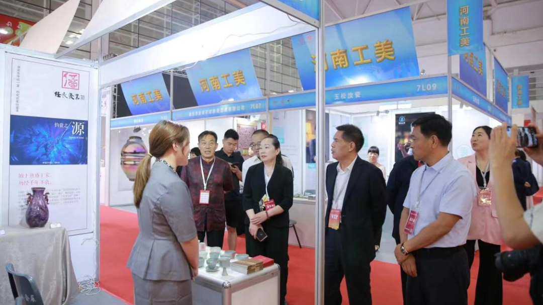 5月9日,河南省工艺美术协会会长寇守锋、副会长孔红生等在郏县任氏瓷业展位前参观。