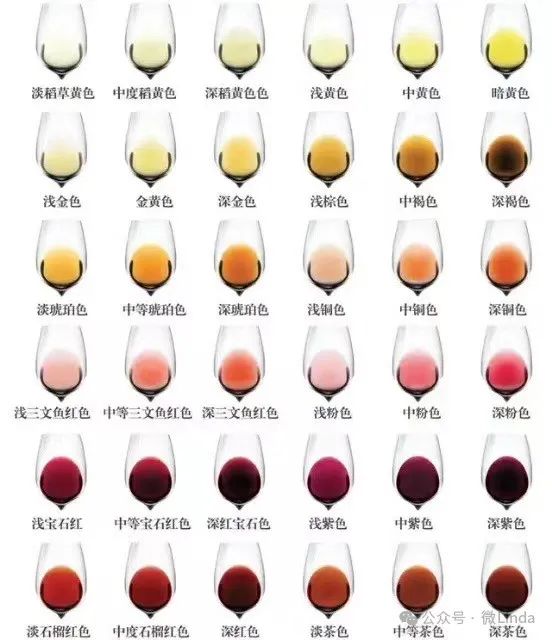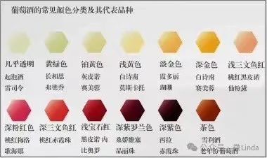 (5)与是否陈年有关随着亚硫酸盐含量的增高,红葡萄酒陈年之后颜色会变浅,其中很多在陈年后由深红色变成了深褐色;白葡萄酒陈年之后颜色会加深,逐渐变成深金色,最后变成棕褐色。红葡萄酒中的单宁随着陈年的氧化过程也会变得越来越柔和,就像苹果放置的久了也会被氧化一样,氧化也让单宁吸附酒液中的色素,红色素日渐减少的葡萄酒颜色由紫红色逐渐变成褐红和橘红色,到了老年期常常只剩下淡淡的砖红色。