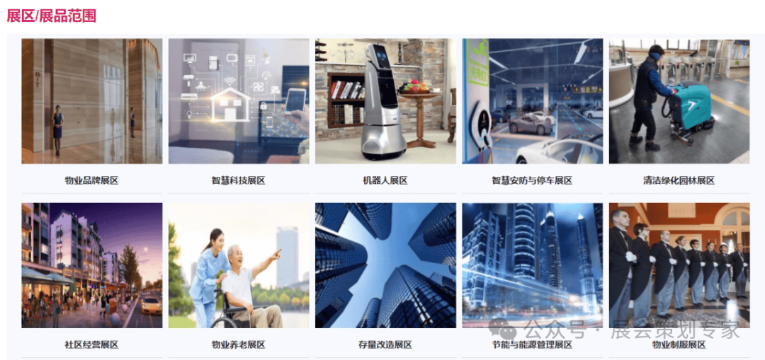 社区经营、物业制 服、清洁绿 化环境、节能 与 能源管理 等多个展区.