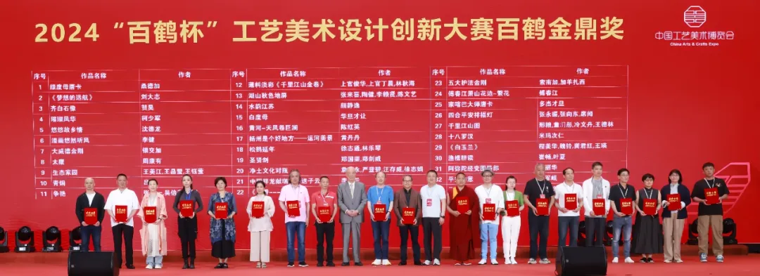 沈国臣在点评“百鹤杯”综合组参评作品时表示,此次大赛各省市踊跃参与,众多能工巧匠和工艺大师的精品力作汇聚一堂,作品在工艺材料、技艺水平和视觉效果上都达到了极高的水准,不同地域文化与民族文化进行多元结合,引领工艺美术行业向更高层次的发展。其中,长30米,高1.2米的《千里江山全卷》运用福州脱胎漆器薄料淡彩的髹饰技艺,层次丰富、色彩沉稳;《四合平安祥福灯》巧妙结合了传统景泰技艺、镶嵌和琉璃等工艺,并融入了语音声控系统,实现了对日用美学的创造性继承;《万壑松泉》将崇山峻岭和青松、流泉完美融合在一幅画面中。《如愿提梁壶》体型饱满、线条简洁多变、细节灵巧生动,展现了当代紫砂的精工细作与抽象艺术的融合。