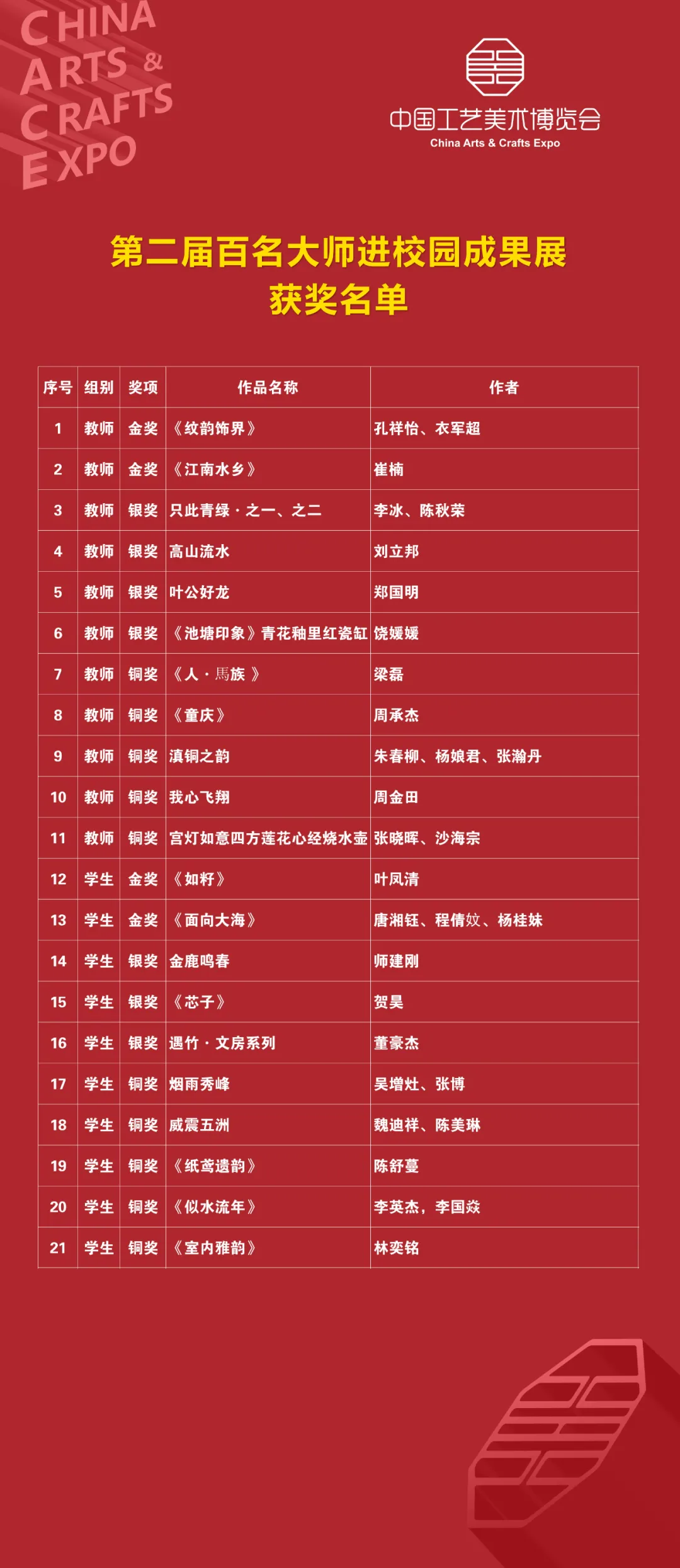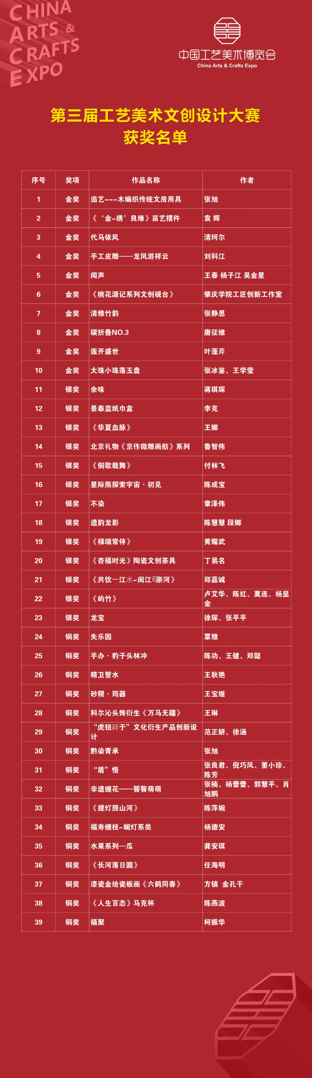 随着闭幕式的举办,第四届中国工艺美术博览会圆满闭幕。展会期间,各大展台人气爆棚,浙江、河南、辽宁等地方展台,福州工美、惠安石雕、德化白瓷等地方特色展团,文创大赛展区、“百名大师进校园成果展”专区、“非遗传统工艺”专题馆备受青睐。历经四届成长,中国工艺美术博览会已成为中国工艺美术行业的“晴雨表”,成为传统工艺产业高水平对外合作的“连心桥”,让我们共同期待明年再见!