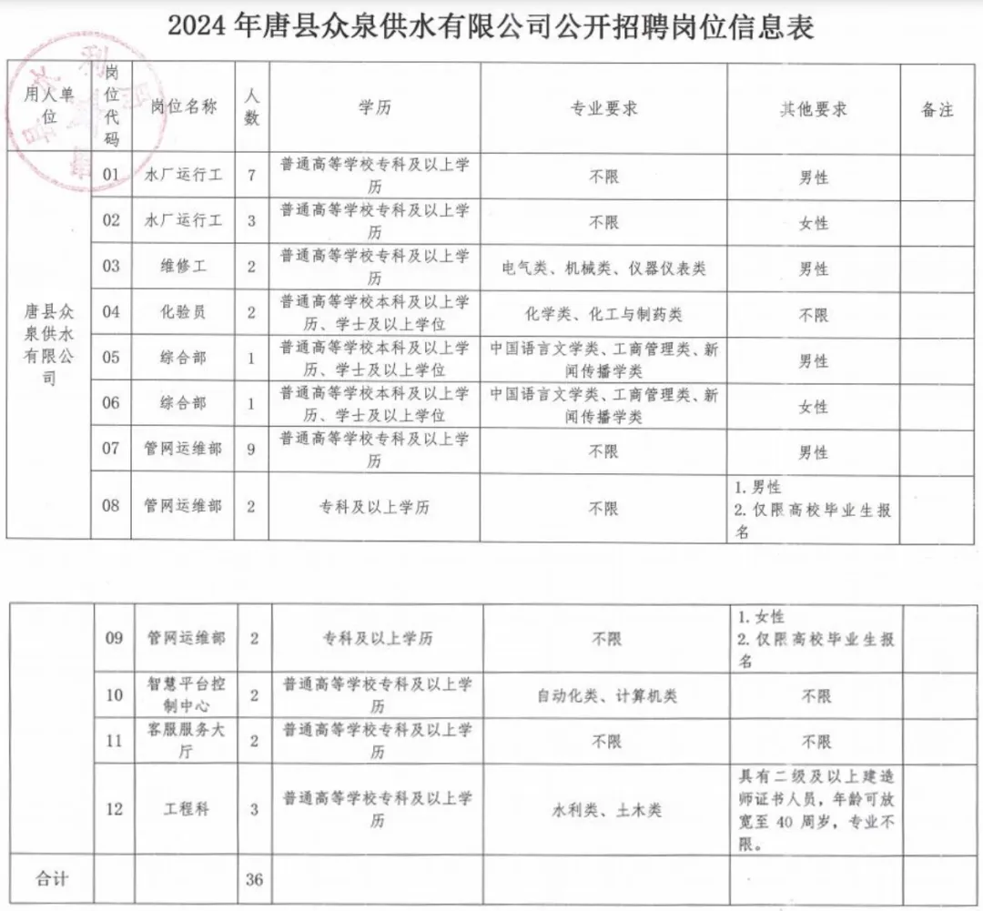 唐县水利局关于2024年众泉供水有限公司公开招聘36名工作人员公告