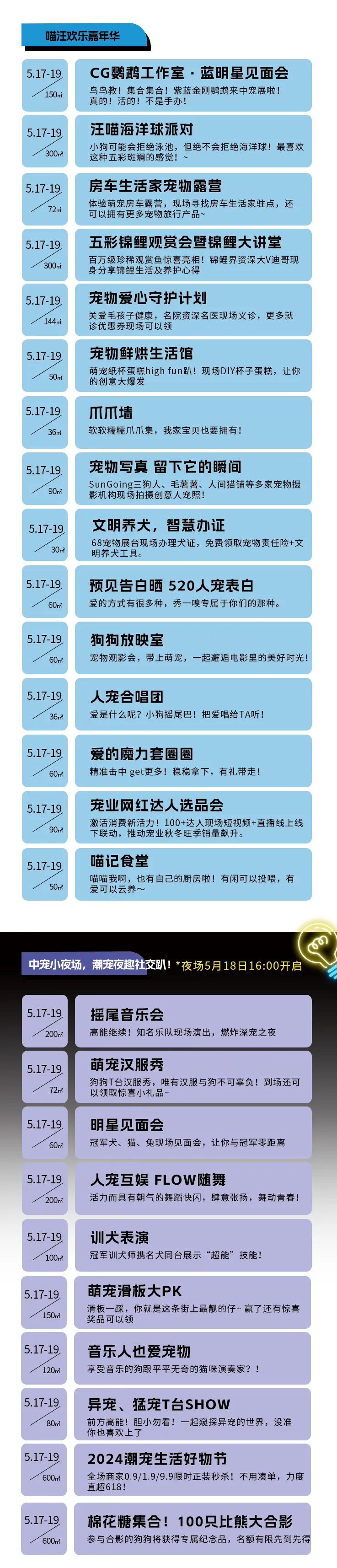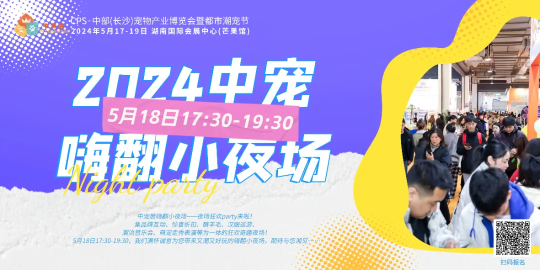 5月18日17:30-19:30中宠展嗨翻小夜场狂欢party将围绕品牌互动、惊喜折扣、薅羊毛、汉服巡游、潮流音乐会、异宠走秀表演、明星见面会等为一体的狂欢奇趣夜场!各大品牌特别推出新品爆款夜场限时秒杀价,打造线下狂欢618,在这里,尽情剁手,满载尽兴而归。