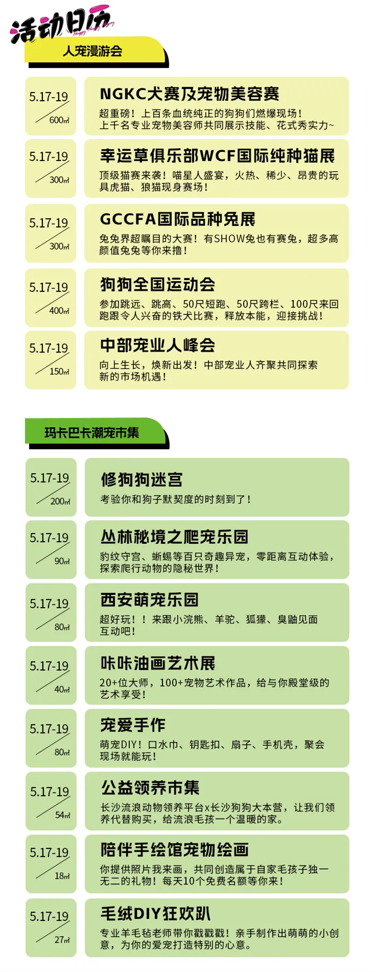 宠物主粮有渴望、爱肯拿、高爷家、Nature Magic自然魔法、Leonardo小李子、比乐、毛球殿下、纽顿、伯纳天纯、雷米高、帕缇朵C3、蓝爪、皮班长、汉优生物等品牌,宠物零食有一只喜欢、MISO、卡斯普、胡子弯弯、猫太郎、K9、扑吃等品牌,宠物玩具有优尚、吉特雅丽、猫咪旺、小佩,贵为等品牌,宠物洗护有超宠爱、YU、小七、臭味等品牌,宠物猫砂有超凡、英麦斯、米小浪、Pidan、小佩、妮可露、之了等品牌,宠物营养品、药品有RedDog红狗、克劳德医生、麦得氏、培宠宝、泰普特,益动等品牌,宠物服饰有禾苒宠物用品科技有限公司、PANHU宠物服饰,宠物笼具有宠迪、乐佳、玛克、爱丽丝等品牌,湖南子非鱼渔业有限公司将携价值百万锦鲤亮相,活体繁育舍有小四犬舍、洋洋宠物、贝屿宠物、Freeze Time缅因猫舍、小震猫舍携可爱萌宠到场,还有长沙湘薇宠物用品、众祥宠物用品、美宠佳宠物用品、长沙晟宠商贸、聚宠生物、英诺威宠物用品有限公司、湖南馨谊商贸有限公司等等让你一展买遍爱宠品质好物~(版面有限,现场更多好物等您嗨购)
