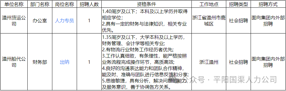 因子公司浙江远洋温州国际货运有限公司业务发展需要,现面向社会诚招人才。具体岗位信息附后。