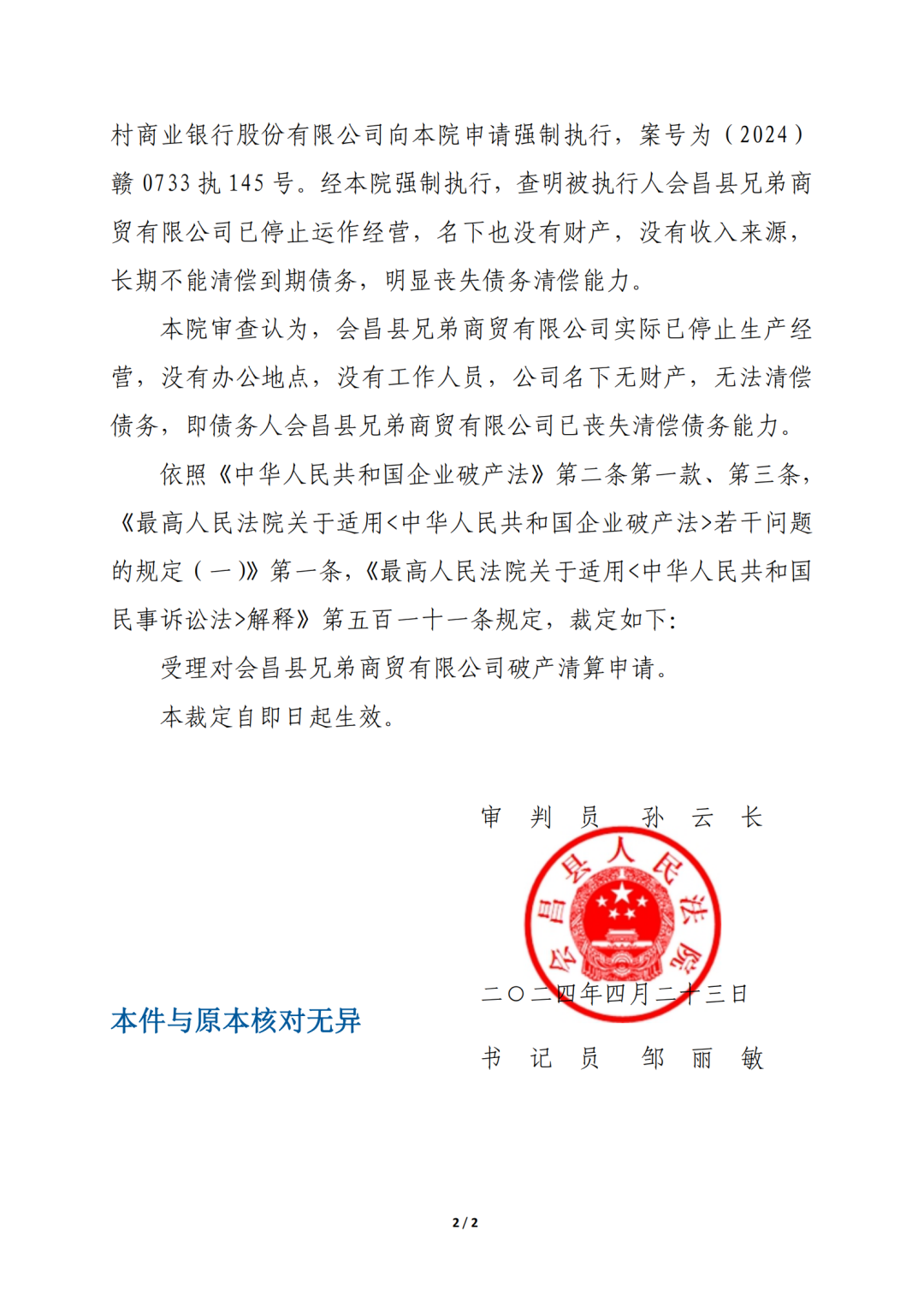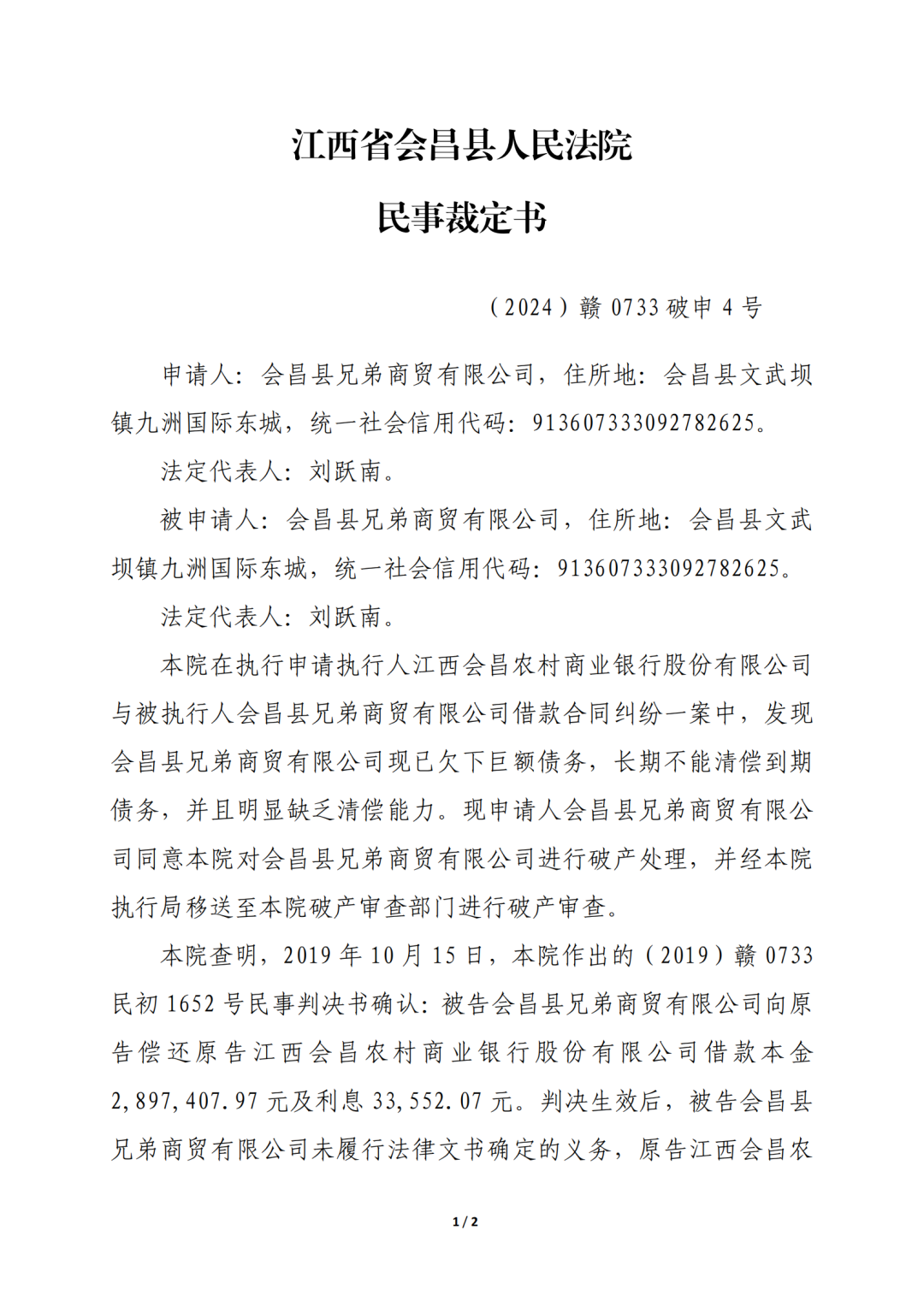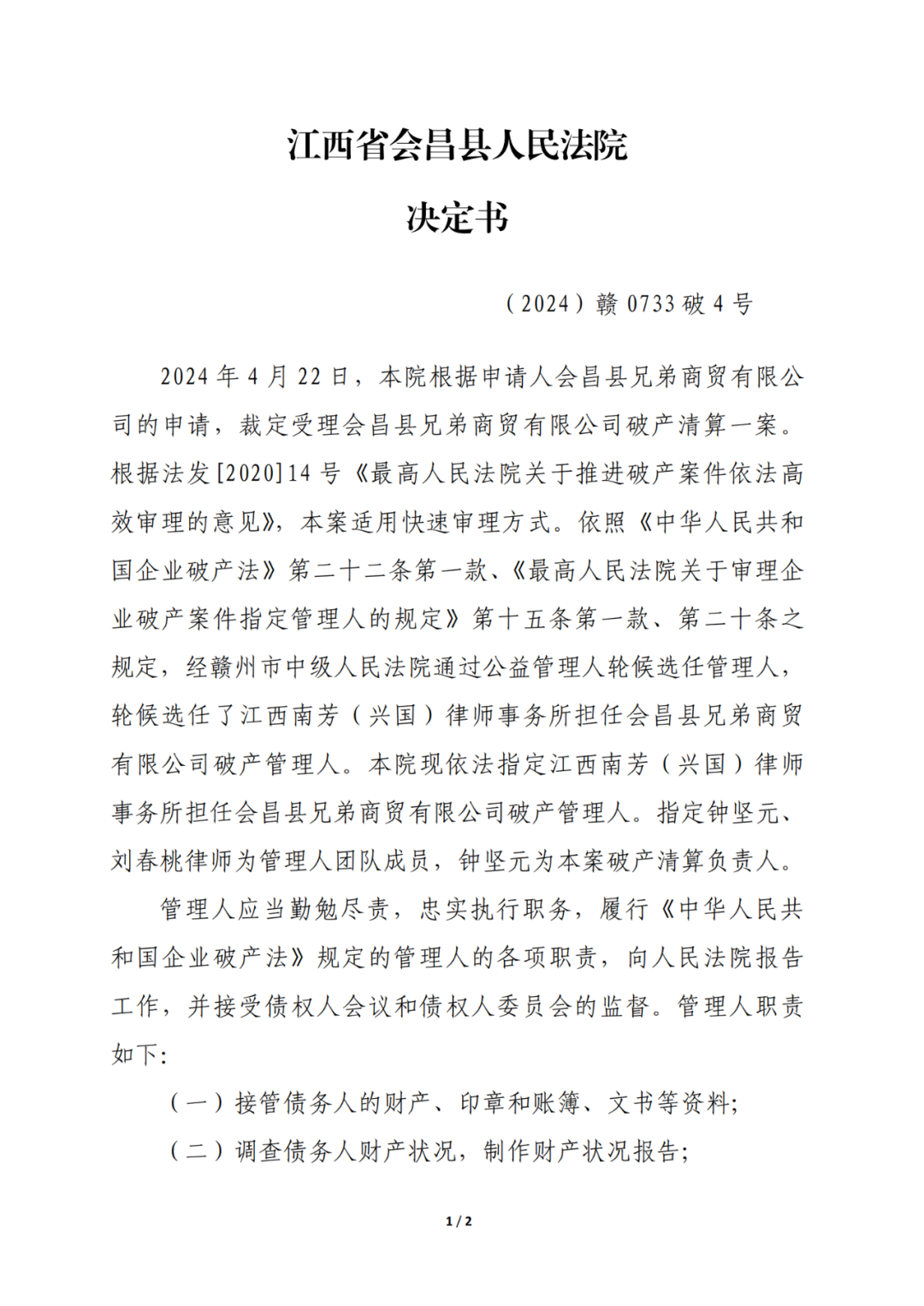 2024年4月22日,江西省会昌县人民法院根据会昌县兄弟商贸有限公司的申请,裁定受理会昌县兄弟商贸有限公司破产清算一案,经赣州市中级人民法院通过公益管理人轮候选任管理人,轮候选任了江西南芳(兴国)律师事务所担任会昌县兄弟商贸有限公司管理人。