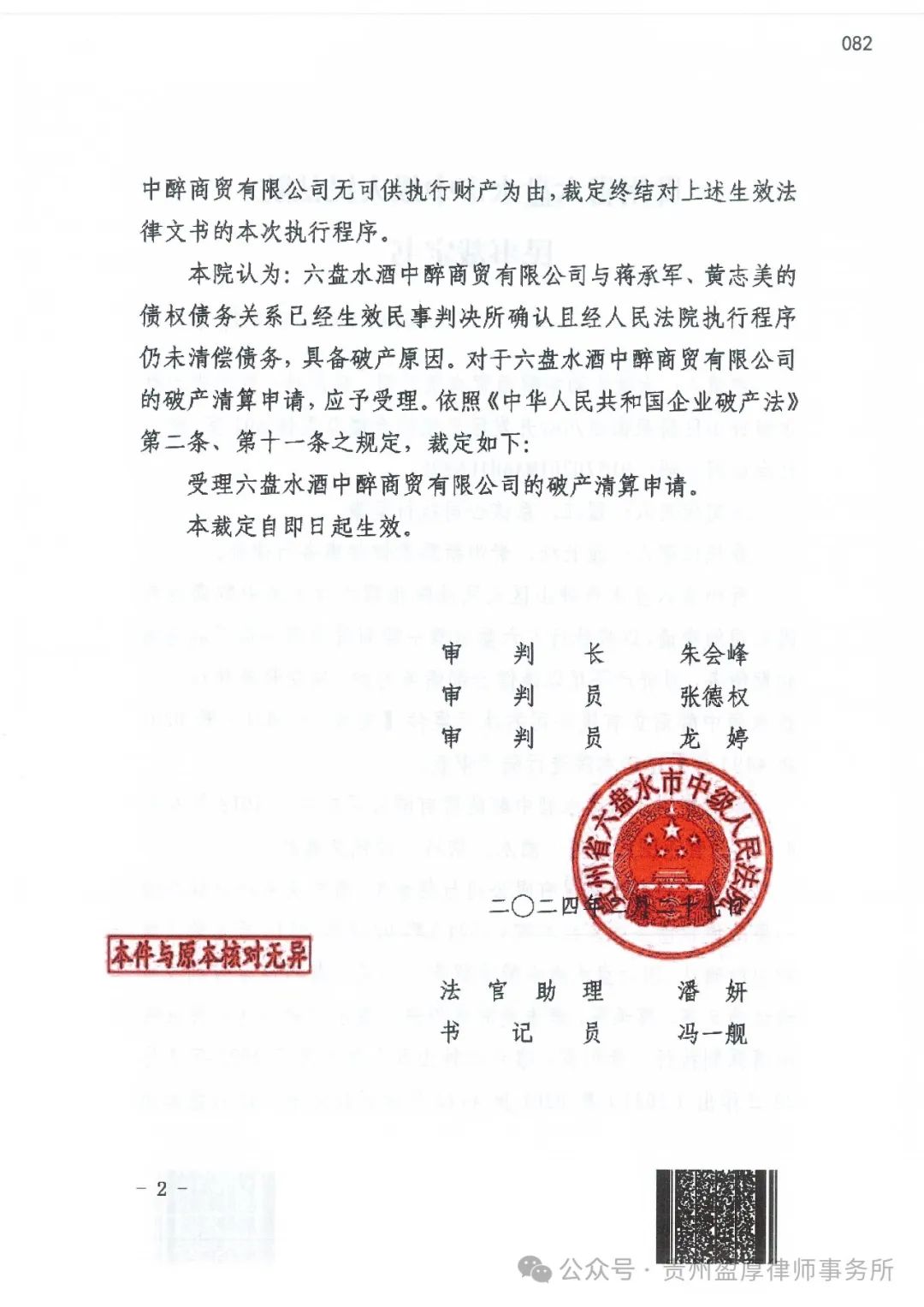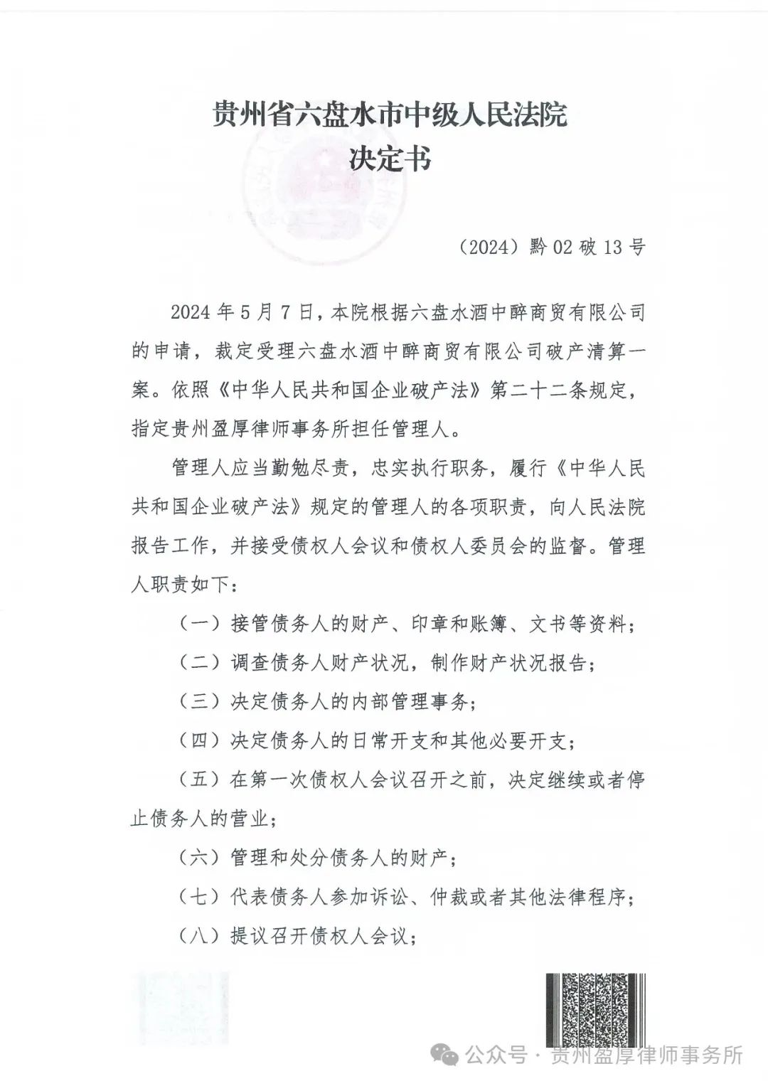 2024年2月27日,六盘水市中级人民法院根据六盘水酒中醉商贸有限公司的申请,作出(2024)黔02破申11号《民事裁定书》,裁定受理六盘水酒中醉商贸有限公司(以下简称“酒中醉公司”或“债务人”)的破产清算申请,并于2024年5月7日作出(2024)黔02破13号《决定书》,指定贵州盈厚律师事务所担任六盘水酒中醉商贸有限公司管理。