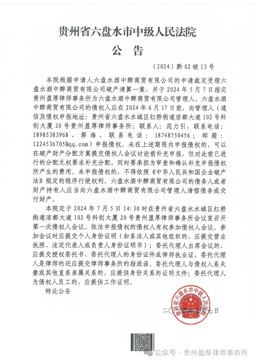 六盘水市中级人民法院定于2024年7月5日下午14:30在贵州盈厚律师事务所会议室召开第一次债权人会议。依法申报债权的债权人有权参加债权人会议,参加会议债权人应提交个人身份证明(如系法人或其他组织的,应提交营业执照、法定代表人或负责人身份证明书);如委托代理人出席会议的,应提交授权委托书、委托代理人的身份证件,委托代理人是律师的还应提交律师执业证和律师事务所的指派函。委托代理人与债权人系夫妻或其他直系亲属关系的,应提供身份关系的证明文件;委托代理人为债权人员工的,应提供工作证明。