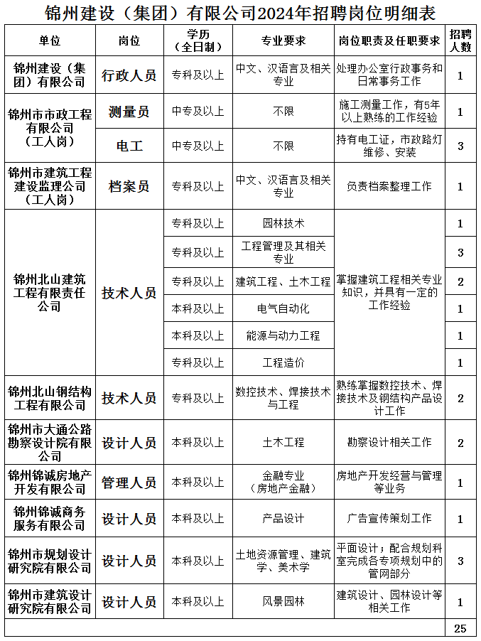 锦州建设(集团)有限公司成立于2018年,注册资本伍亿元,隶属于市国资委,是国有独资大型企业集团,下辖13个子公司,现有员工900余人,建设集团主营业务:建设工程施工,住宅室内装饰装修,房地产开发经营,建设工程设计,建设工程监理,测绘服务;园林绿化工程施工,土石方工程施工,金属结构制造,工程管理服务。为满足战略布局与业务发展需要,进一步加强人才队伍建设,2024年拟公开招聘25人。1.具有中华人民共和国国籍;拥护中国共产党领导,遵守国家宪法和法律;具有较强的职业素养和事业心、责任感,爱岗敬业,吃苦耐劳,具有良好的沟通协调、持续学习能力和开拓创新精神。4.中专及以上学历,年龄35周岁(含)以下(1988年6月30日以后出生),全日制研究生及双一流院校毕业的可适当放宽。5.境内院校毕业生必须获得国家认可的毕业证、学位证;境外院校毕业生须取得相关学历证书及国家教育部颁发的学历认证材料。1.正在接受司法机关立案侦查或纪检监察机关立案审查的。3.处于受处分期间(刑事、治安处罚)或者未满影响期限的。8.本人或家庭成员及近亲属参加非法组织、邪教组织或从事其他危害国家安全活动的人员。(一)岗位条件、专业要求,详见岗位明细表(附件)(见文中最下方)。(二)有本企业所需的注册类证书或有省级以上设计类和工程类发明专利的,条件可适当放宽。 1.执行集团统一工资制度,实行相应岗位薪酬标准和福利待遇。 招聘工作按照发布公告、网络报名、资格审查、笔试、面试、考察、体检、公示、录用等程序进行。招聘信息将通过锦州市国资委网站、锦州市人才网、锦州建设集团企业公众号、“优企职达”公众号发布。(2)报名人员需将个人资料上传到报名网站,附件内容包括:本人近期免冠正面证件照及所报名职位条件要求的个人身份证明、学历学位证明、上传教育部学历证书电子注册备案表、教育部学籍在线验证报告;涉及国外学历学位者须提供教育部留学服务中心出具的认证报告扫描件;专业技术资 格证书、职业资格证书等相关证明材料(原件扫描为JPG或 PDF格式)。根据招聘条件及应聘者提交的应聘材料进行资格审查。招聘项目组将通过电话、短信等方式通知审查通过者参加笔试,未通过者不再另行通知。1.根据资格审查结果确定笔试人员名单(具有双一流大学本科学历学士学位和普通高校研究生学历硕士学位以上且专业对口可免笔试,直接进入面试程序,同等条件下优先录用)。3.具体笔试时间将以短信形式发送至入选人员手机,请收到短信人员务必按照短信提示时间回复是否参加笔试,未回复短信者,招聘项目组会以电话进行沟通确保收到相关信息,若未能接通者,视为放弃笔试机会。4.笔试采取闭卷方式进行,根据笔试成绩,从高分到低分,不高于1:3确定面试人选,如有并列则同时进入面试环节。2.面试时间及地点:具体面试时间及地点将以短信形式发送至入选人员手机,请收到短信人员务必按照短信提示时间回复是否参加面试,未回复短信者,招聘项目组会以电话进行沟通确保收到相关信息,若未能接通者,视为放弃面试机会。根据综合成绩(笔试成绩*50%十面试成绩*50%)排名确认为拟录用人选。对拟录用人选进行资格条件的复审、背景调查及深度考察。考察中发现不符合聘用条件的,取消其录用资格,并将结论及依据明确告知被考察人员。考察合格者,确定为拟录用人员。体检标准参照国家公务员录用标准执行,对拟聘用人员须在三甲级以上医院进行新员工入职项目体检。体检不合格者或放弃体检者,不予聘用,将在考察人员中依序递补。体检时间另行通知。(费用自理)根据考察结果确定拟聘人选,考试成绩在市国资网站等平台进行公布,公示时间为3天。1.经公示无异议的拟录用人员,国资委备案后统一安排上岗。2.集团对首次录用人员实行统一标准的聘用制度,试用期管理及考核按集团统一规定执行。(一)报名者须对照本公告规定的条件如实申报,在整个招聘过程中,一经发现不符合规定的,则取消资格,责任自负。(二)本次考试不收取任何费用,不指定考试辅导用书,不举办也不委托任何机构举办考试辅导培训班。(五)招聘项目组咨询电话:024-81046045周一至周五9:00-11:30,13:30-17:00