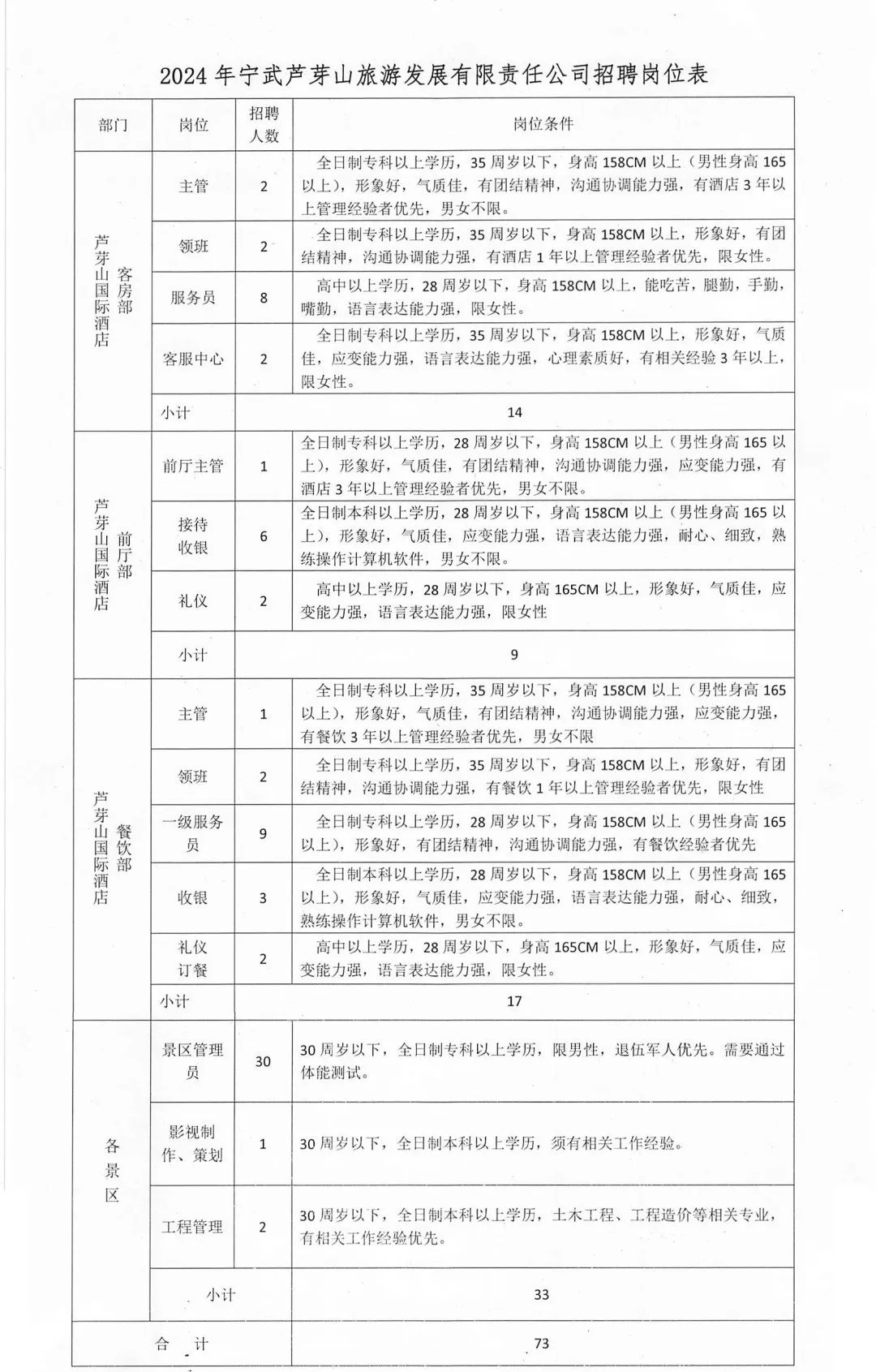 宁武芦芽山旅游发展有限责任公司位于山西省忻州市宁武县东寨镇,成立于2007年,公司注册资本2亿元。景区总面积321平方公里,平均海拔2000米以上,是山西省第二大旅游景区,先后被命名为国家地质公园、国家森林公园、国家自然保护区、国家水利风景区及中国民间文化旅游示范区,目前共有8个景点。公司致力于将芦芽山景区打造为全国一流风景名胜区,力争使景区各项基础建设和服务设施达到国内一流水平。现面向社会为芦芽山景区及芦芽山国际酒店招聘工作人员若干,具体招聘事项公告如下: