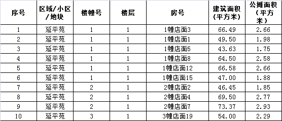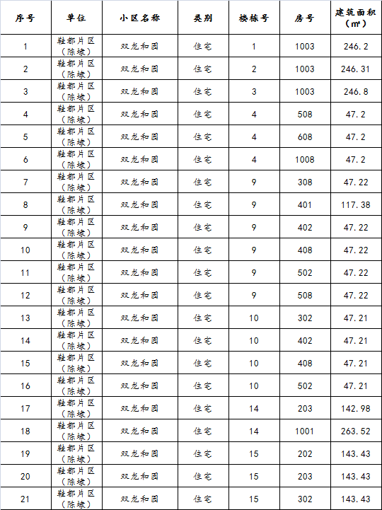双龙和园住宅21套、双龙嘉园住宅3套、双龙星城住宅140套、兴霞花园住宅47套、延平苑店面10间、水心苑店面5间、仁福苑店面14间、咸德苑店面2间。