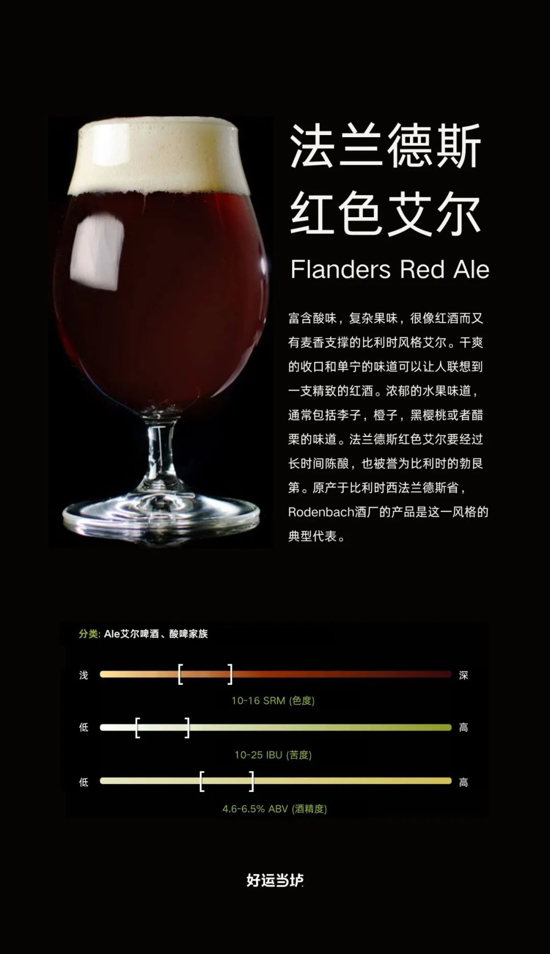 富含酸味,复杂果味,很像红酒而又有麦香支撑的比利时风格艾尔。干爽的收口和单宁的味道可以让人联想到一支精致的红酒。