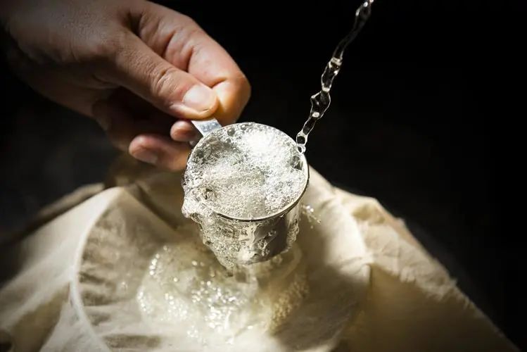 接完酒头后流出来的新酒叫做蒸馏酒。也叫酒身,度数在50-60度左右,酒精分子与水融合程度最好,而且这个阶段有害物质最低,是整锅酒中质量最优质的部分。