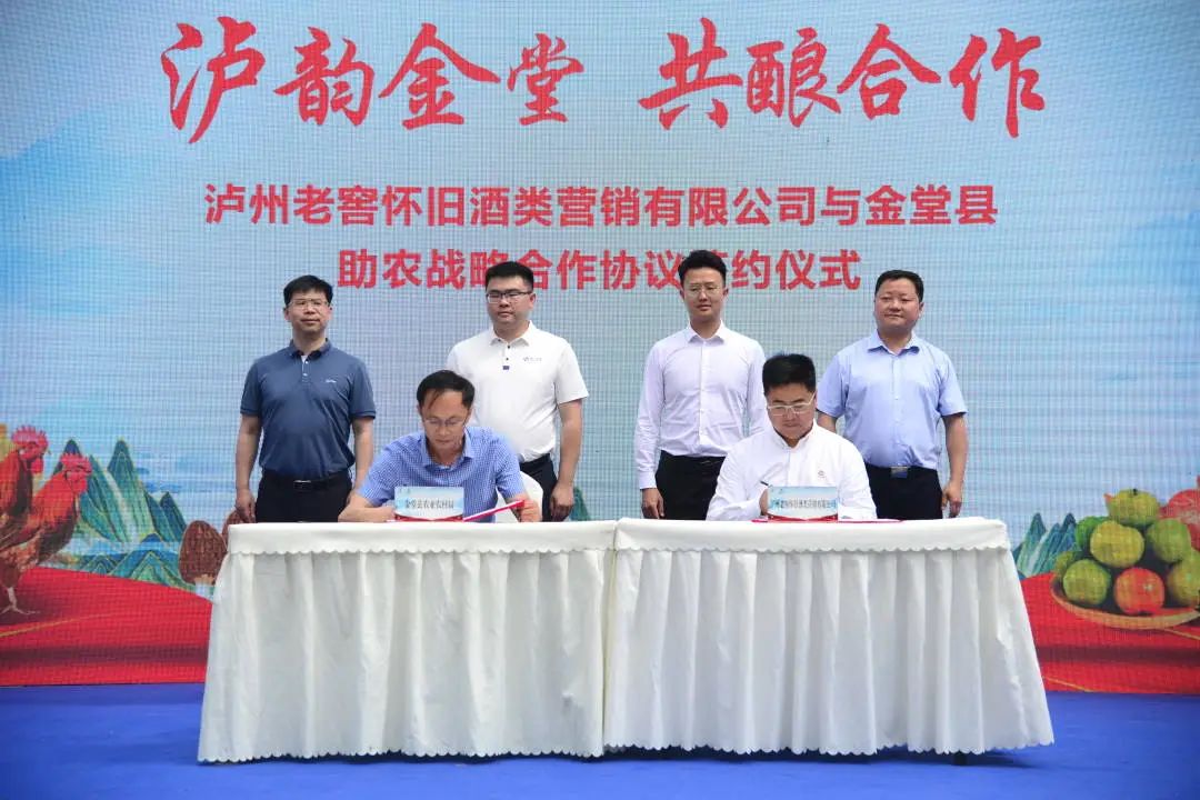 活动中,泸州老窖怀旧酒类营销有限公司金堂县乡村振兴政企助农基地正式揭牌,泸州老窖怀旧酒类营销有限公司还分别与高板街道玉亭村集体经济组织成都禹善玉桐农业有限公司、金堂县农业农村局签订了农产品购销协议、助农战略合作框架协议。