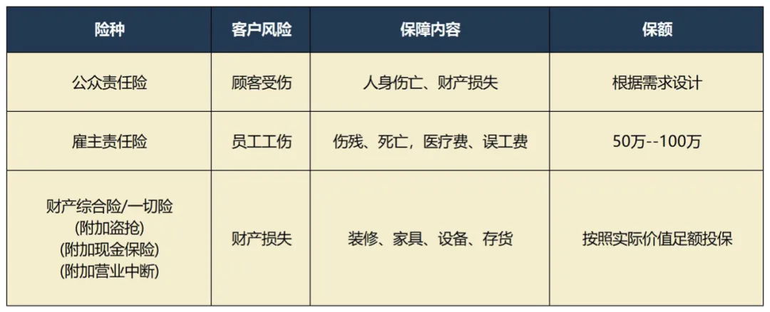 约定每次事故赔偿限额、每次财产赔偿限额、每次人身赔偿限额、每次每人赔偿限额以及免赔额等。保费需要根据餐饮店的面积、保障额度等因素进行评估,一般保费一年千元起。