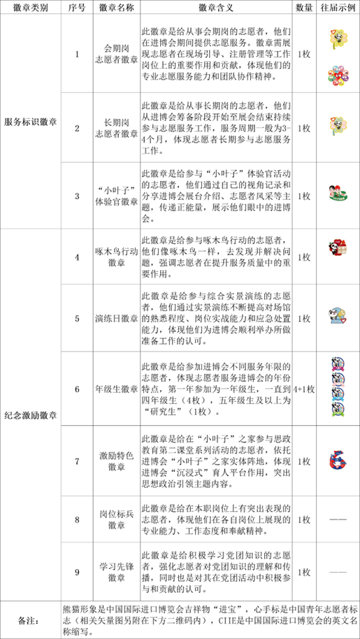 市级徽章作品征集:以“汇聚志愿力量,共绘开放未来”为主题,围绕“新时代,共享未来”的进博会主题口号,创作出既具有文化性、艺术性,又兼具实用性的志愿者徽章。