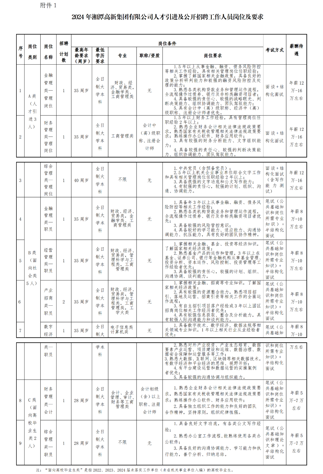 本次计划人才引进和公开招聘10名工作人员,分A类(人才引进3人)、B类(面向社会类5人)、C类(面向高校毕业生类2人)。本次人才引进及公开招聘坚持“公开、平等、竞争、择优”的原则,严格考核,宁缺毋滥,择优录用。具体招聘岗位、计划及条件详见《2024年湘潭高新集团人才引进及公开招聘工作人员岗位及要求》(附件1)。详情可查询湘潭高新区官网(http://xthtz.xiangtan.gov.cn/)发布的招聘公告。