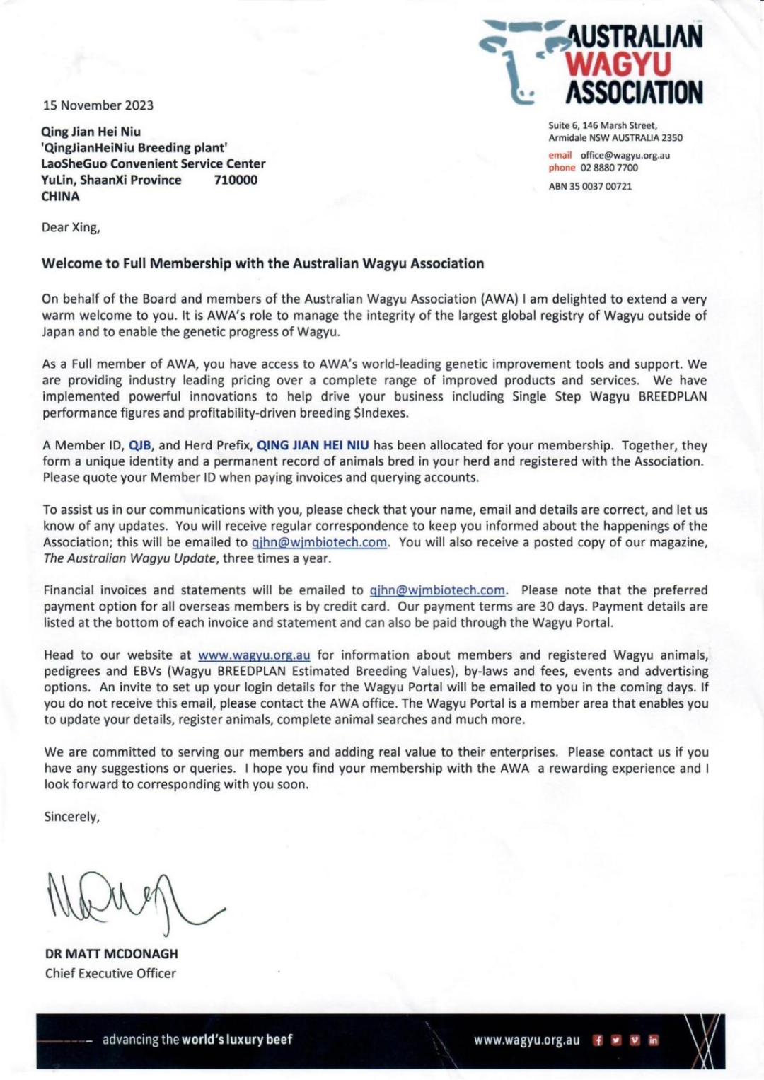 清涧黑牛注册成为澳大利亚和牛协会(AWA)会员的通知书