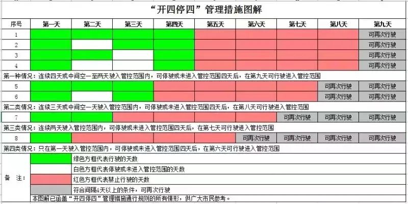 广州限行的核心内容是“开四停四”管理措施,即非广州市籍中小客车(含临时号牌车辆)驶入管控区域连续行驶时间最长不得超过4天,再次驶入须间隔4天以上。