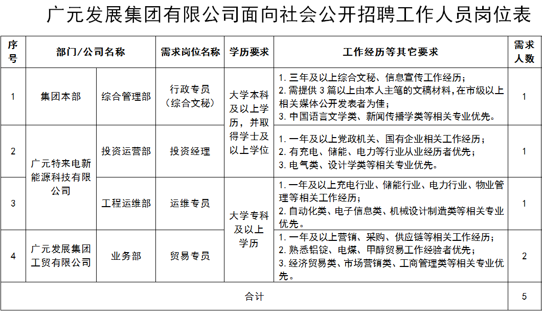 本次计划招聘工作人员5名,具体岗位及招聘条件见《广元发展集团有限公司面向社会公开招聘工作人员岗位表》(附件1)。