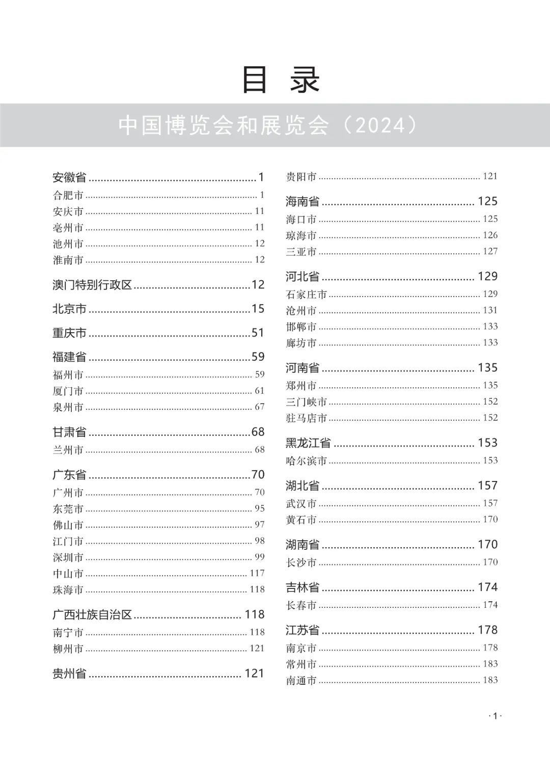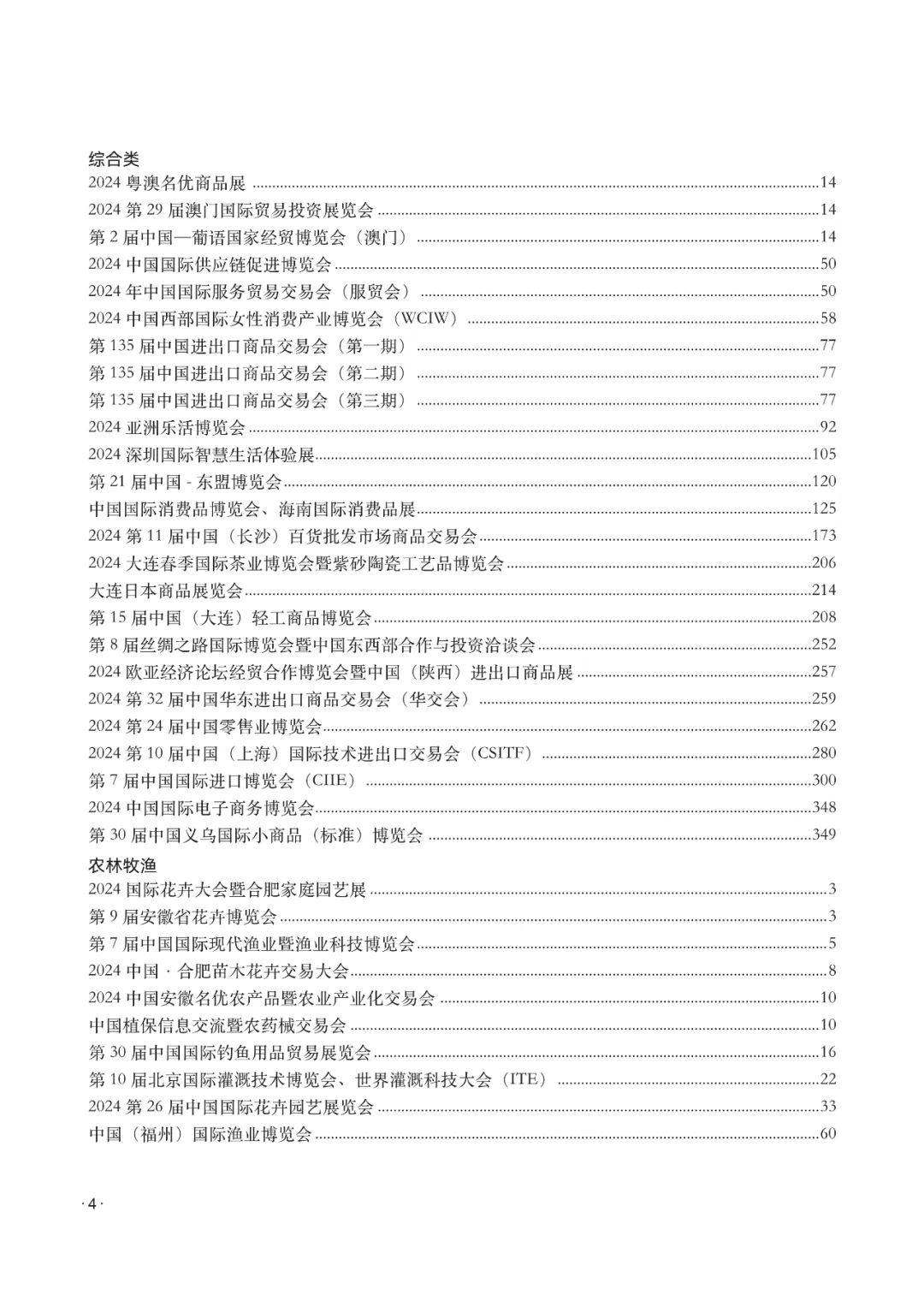 2024年版的指南涵盖了中国32个省区市及香港、澳门特别行政区共80余个城市的1400余场经贸类展览会项目。信息收集截止日期为2023年12月15日,包括展览会名称、举办时间、地点、主承办机构、展出内容和联系方式等详细信息。读者可以按照展览会的举办城市或涉及的行业进行查询。