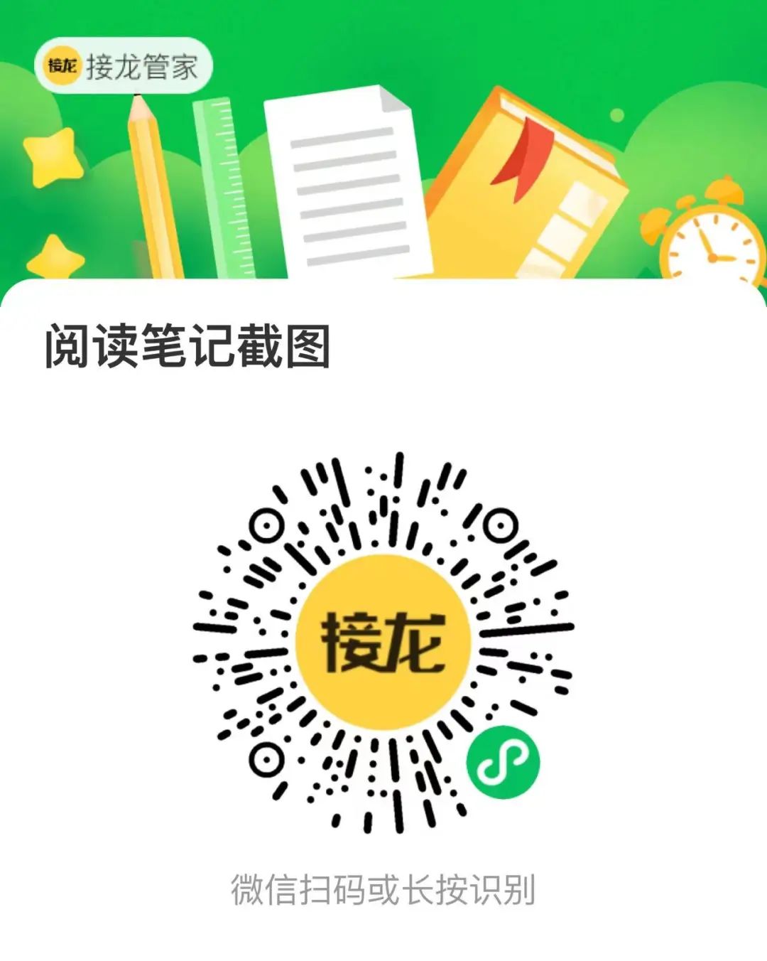 鼓励同学们在阅读过程中,记录自己的阅读笔记,并拍摄与书籍的合影。同学们将阅读笔记与书的合影发送至下方对应二维码。