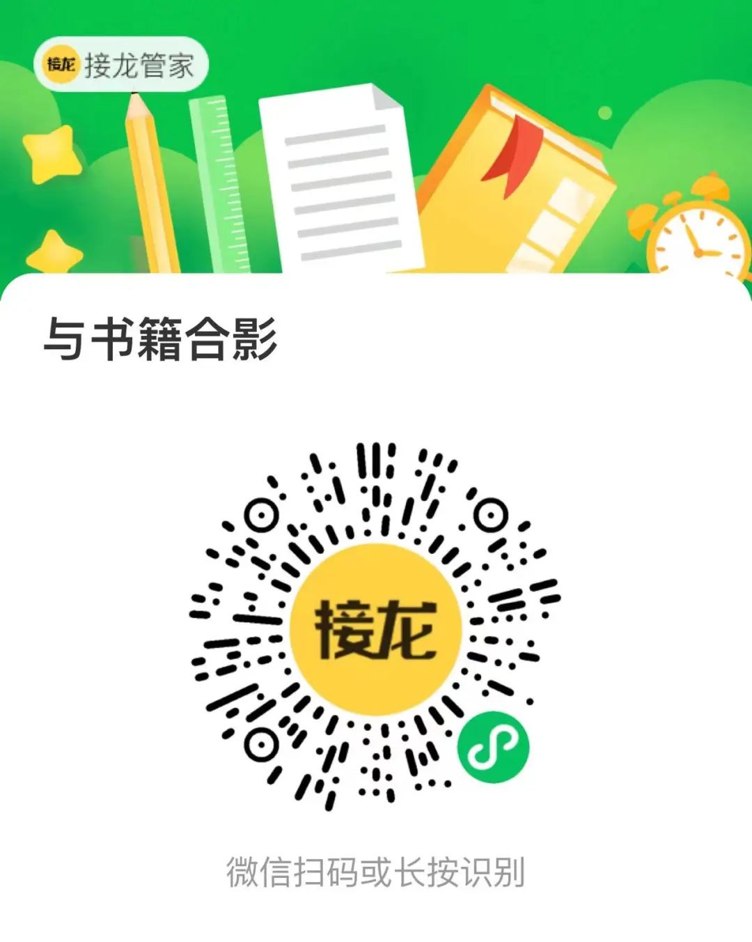 扫描推荐书籍推文右侧的二维码提交你与书籍的合影,可自拍或他拍,需填写好姓名、班级、学号。