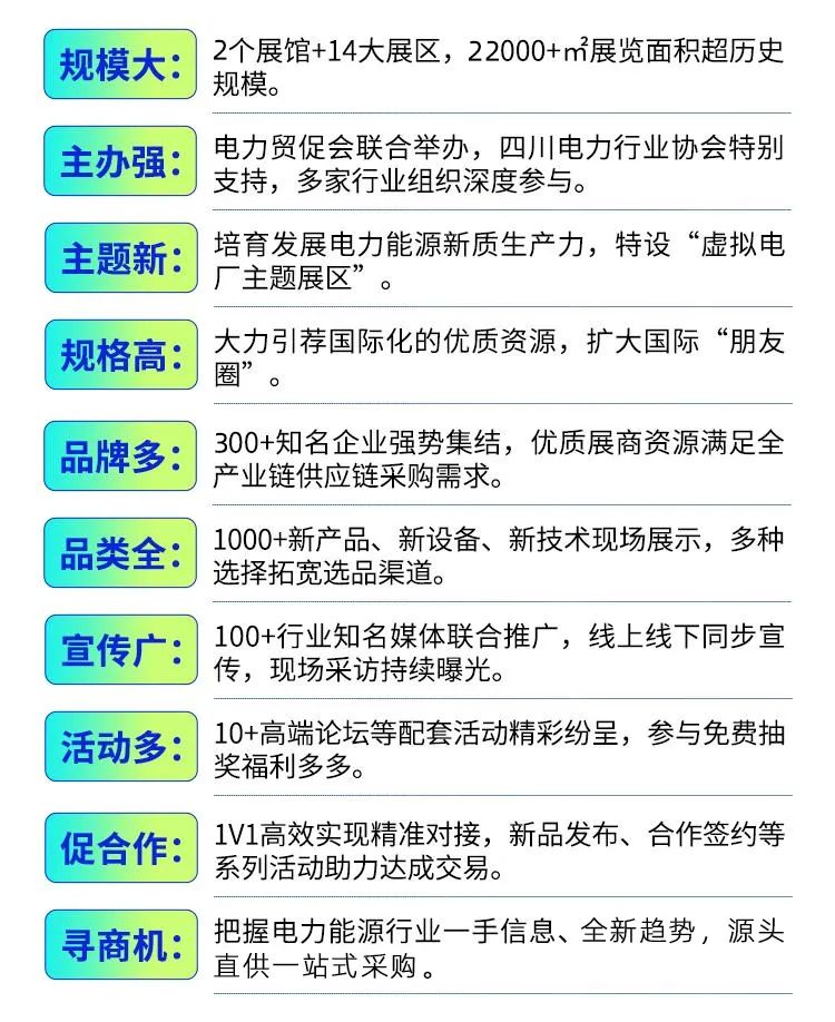 作为中国中西部电力能源行业规模最大的展示交流平台,本次博览会以“绿色发展·能动未来”为主题,聚焦新型电力系统和新型能源体系相关产业发展成果,设立新型电力系统、源网荷储、水风光氢三大热点板块和虚拟电厂主题展区,集中展示发电、储能、输电、变电、配电、用电等产业链供应链各环节的新材料、新产品、新设备、新技术及解决方案。