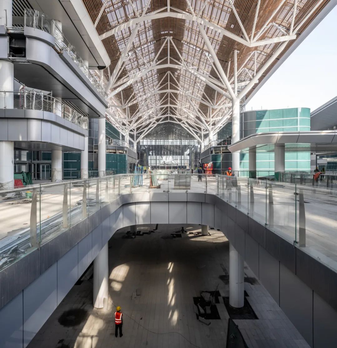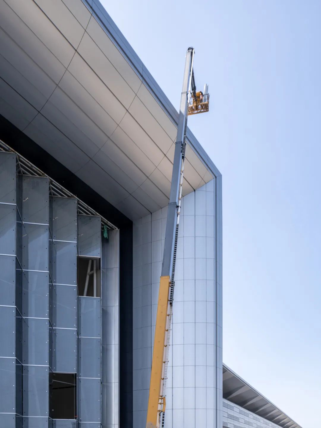 从空中俯瞰,杭州大会展中心一期工程的整体造型犹如一艘乘风破浪的巨轮,屹立在大地之上。那条长达500米、跨度超过18米的中央廊道,宛如高耸的桅杆,屹立不摇,引领着船头向前破浪前行。它巧妙地串联起了一期1-8号展馆,形成了一幅气势磅礴的画卷。