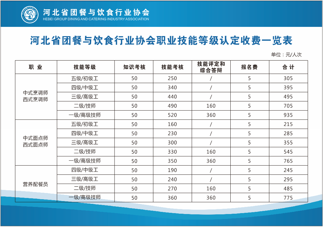 为全面提升河北省餐饮行业职业技能水平,培养出一支高素质、高标准、高质量的高技能人才队伍,为餐饮行业储备更多专业优秀人才。同时应广大会员单位的要求,河北省团餐与饮食行业协会长期举办餐饮业职业技能提升认定考试,现开始报名。有关申报条件和事项如下: