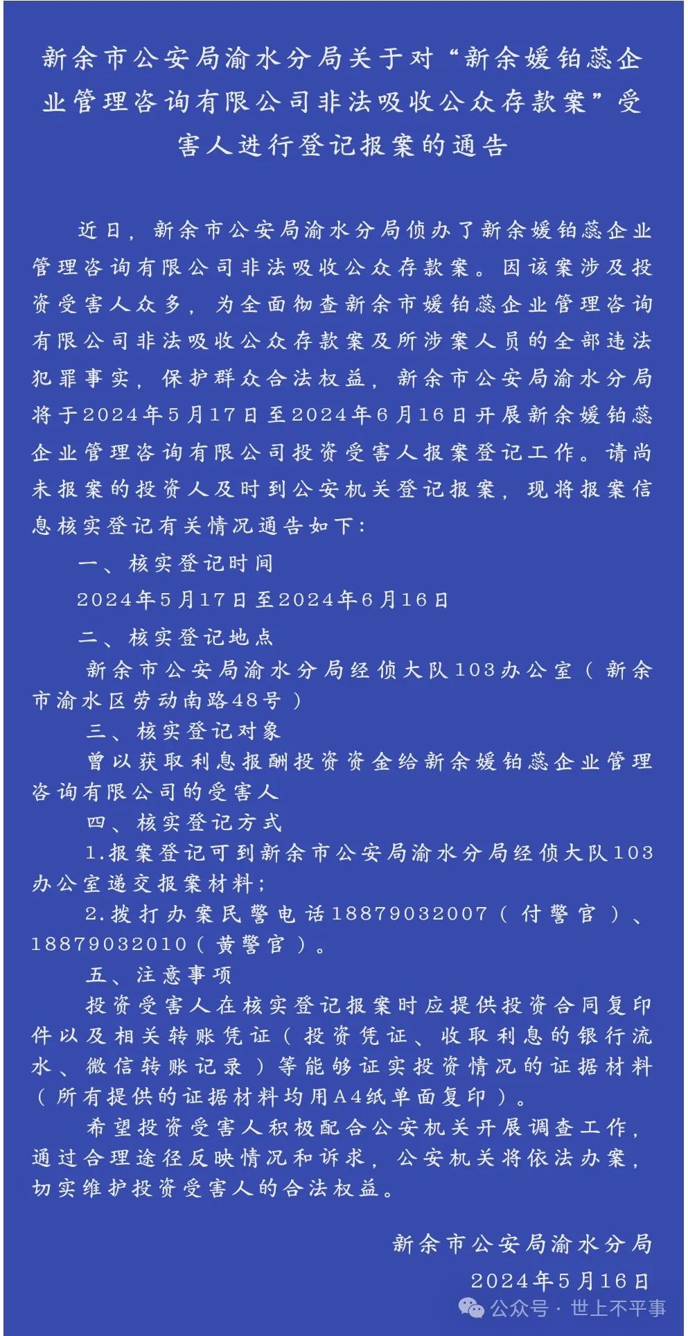 2024年5月16日,新余市公安局渝水分局对外发布了关于对“新余媛铂蕊企业管理咨询有限公司非法吸收公众存款案”受害人进行登记报案的通告。具体如下: