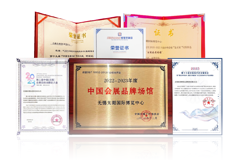 两年来,无锡太湖国际博览中心凭借其卓越的服务质量、高效的运营效率和出色的安全保障措施,荣获2022-2023年度中国会展品牌场馆、2023"金五星"优秀会展场馆奖等多项行业大奖。同时,收到了贸促会、公安局、农业农村局、体育局等多封来自主办方的感谢信。这些殊荣不仅是对无锡震泽团队不懈努力和出色成果的最高认可,更是激励持续前进的强大动力。