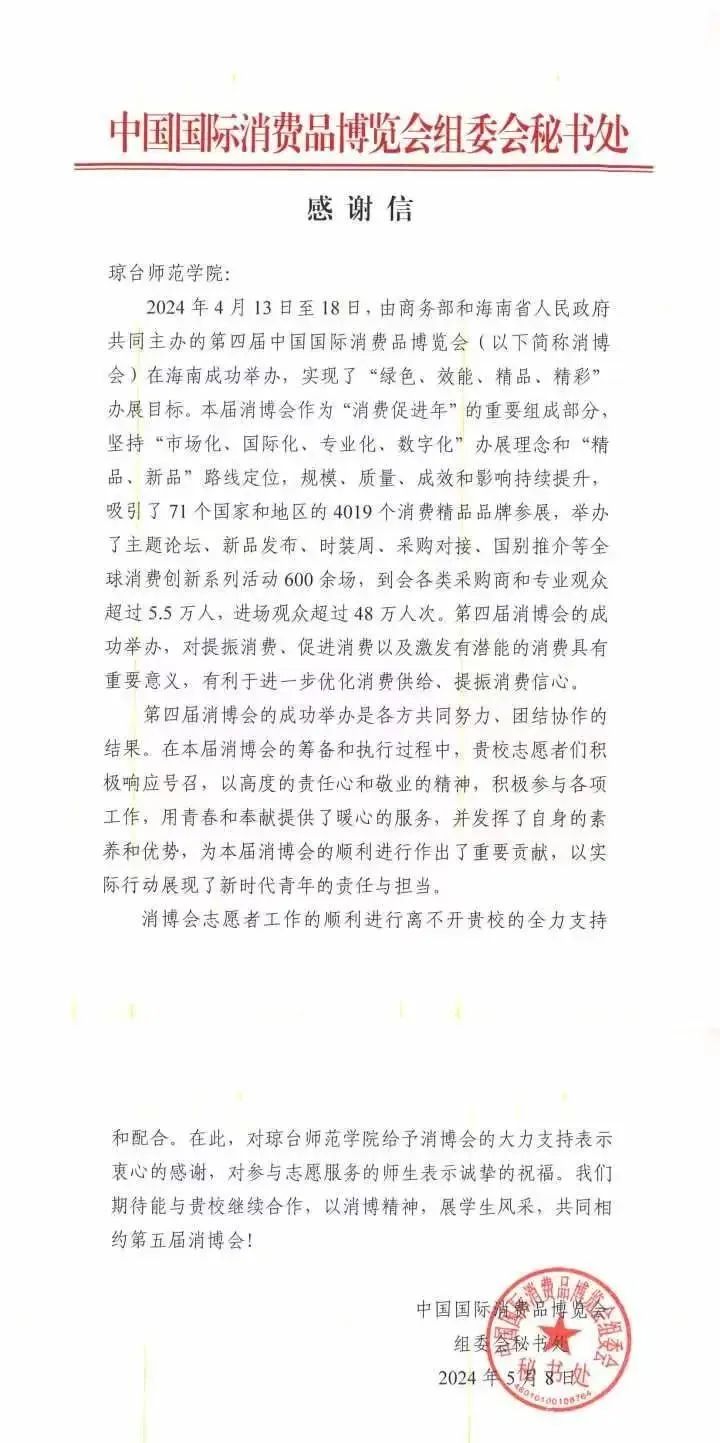 近日,我校收到中国国际消费品博览会组委会秘书处的感谢信,对我校师生积极参与第四届消博会志愿服务工作给予高度评价,对于青年志愿者在消博会中以强烈的责任感以及充沛的热情为相关工作的顺利推进所做出的积极贡献,表示诚挚而衷心的感谢。