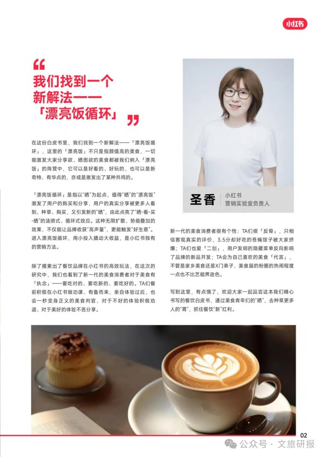 在这份白皮书里,我们找到一个新解法——【漂亮饭循环」,这里的「漂亮饭」不只是指颜值高的美食,一切能激发大家分享欲、晒图欲的美食都被我们纳入「漂亮饭」的阵营中,它可以是好看的、好玩的,也可以是新奇特、有华点的,亦或是激发出了某种共鸣的。「漂亮饭循环」是指以“晒"为起点,值得“晒”的“漂亮饭”激发了用户的购买和分享,用户的真实分享被更多人看到、种草、购买,又引发新的“晒”,由此点亮了“晒-看-买-晒”的涟漪式、循环式效应。这种无限扩散、势能叠加的效果,不仅能让品牌收获“高声量”,更能触发“好生意”。进入漂亮饭循环,用小投入撬动大收益,是小红书独有的营销方法。除了摸索出了餐饮品牌在小红书的高效玩法,在这次的研究中,我们也看到了新一代的美食消费者对于美食有「执念」——要吃对的、要吃新的、要吃好的。TA们餐前积极在小红书做功课、有备而来,亲自体验过后,也会一秒变身正义的美食判官,对于不好的体验积极劝退、对于美好的体验不吝分享。新一代的美食消费者很有个性:TA们很「反骨」,只相信客观真实的评价,3.5分却好吃的苍蝇馆子被大家挤爆;TA们也爱「二创」,用户发明的隐藏菜单反向影响了品牌的新品开发;TA会为自己喜欢的美食「代言」,不管是家乡美食还是X门弟子,美食届的粉圈的热闹程度一点也不比艺能界逊色。写到这里,有点饿了,欢迎大家一起品尝这本我们精心书写的餐饮白皮书,通过美食青年们的“晒”,去种草更多人的“胃”,抓住餐饮“新”红利。