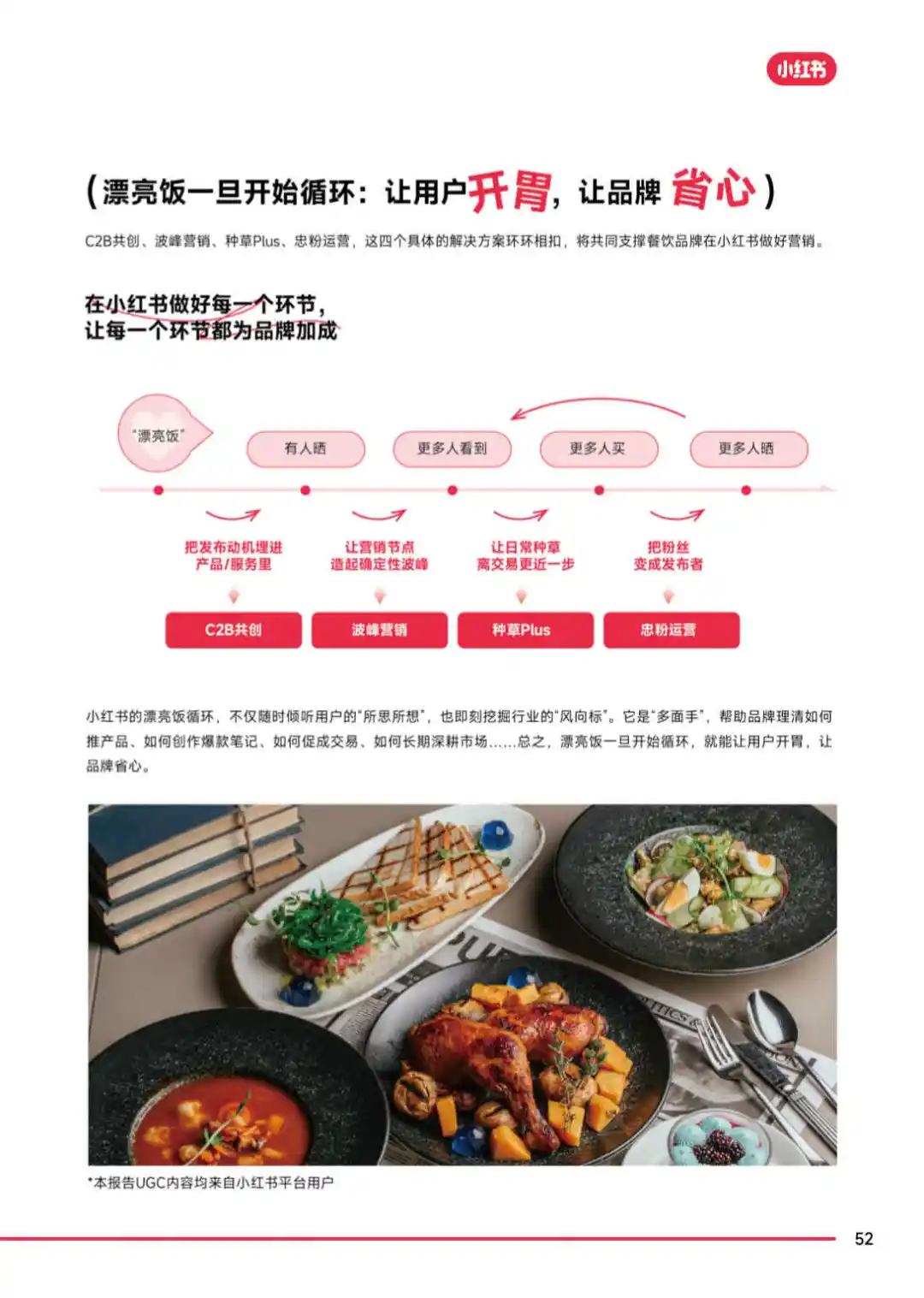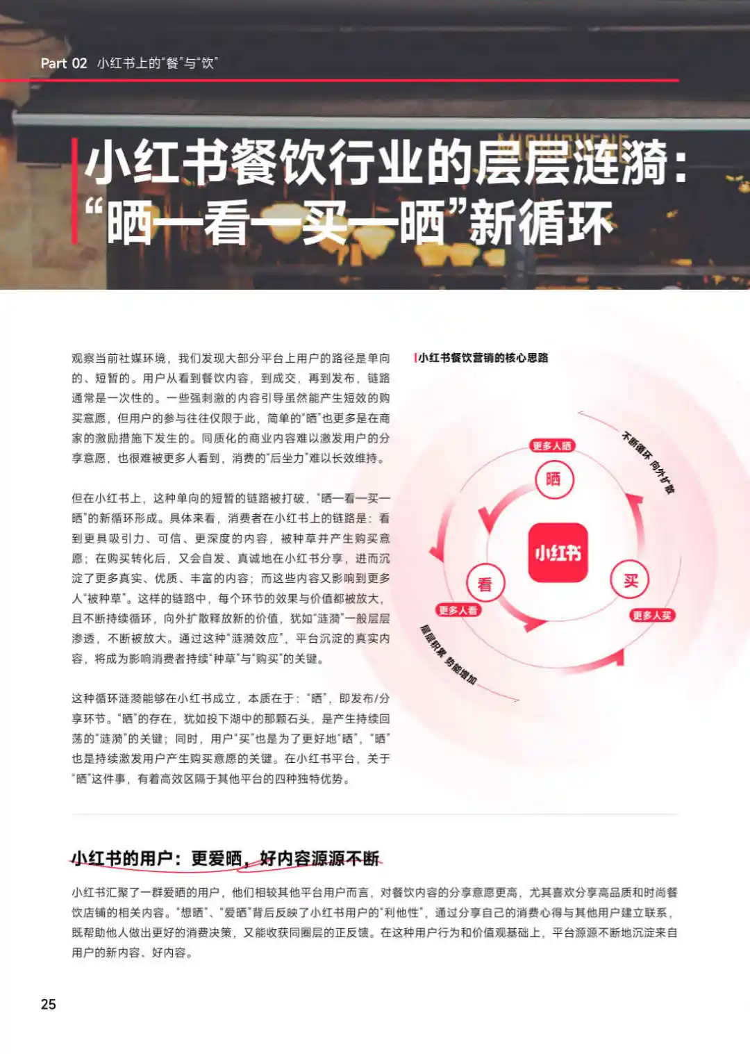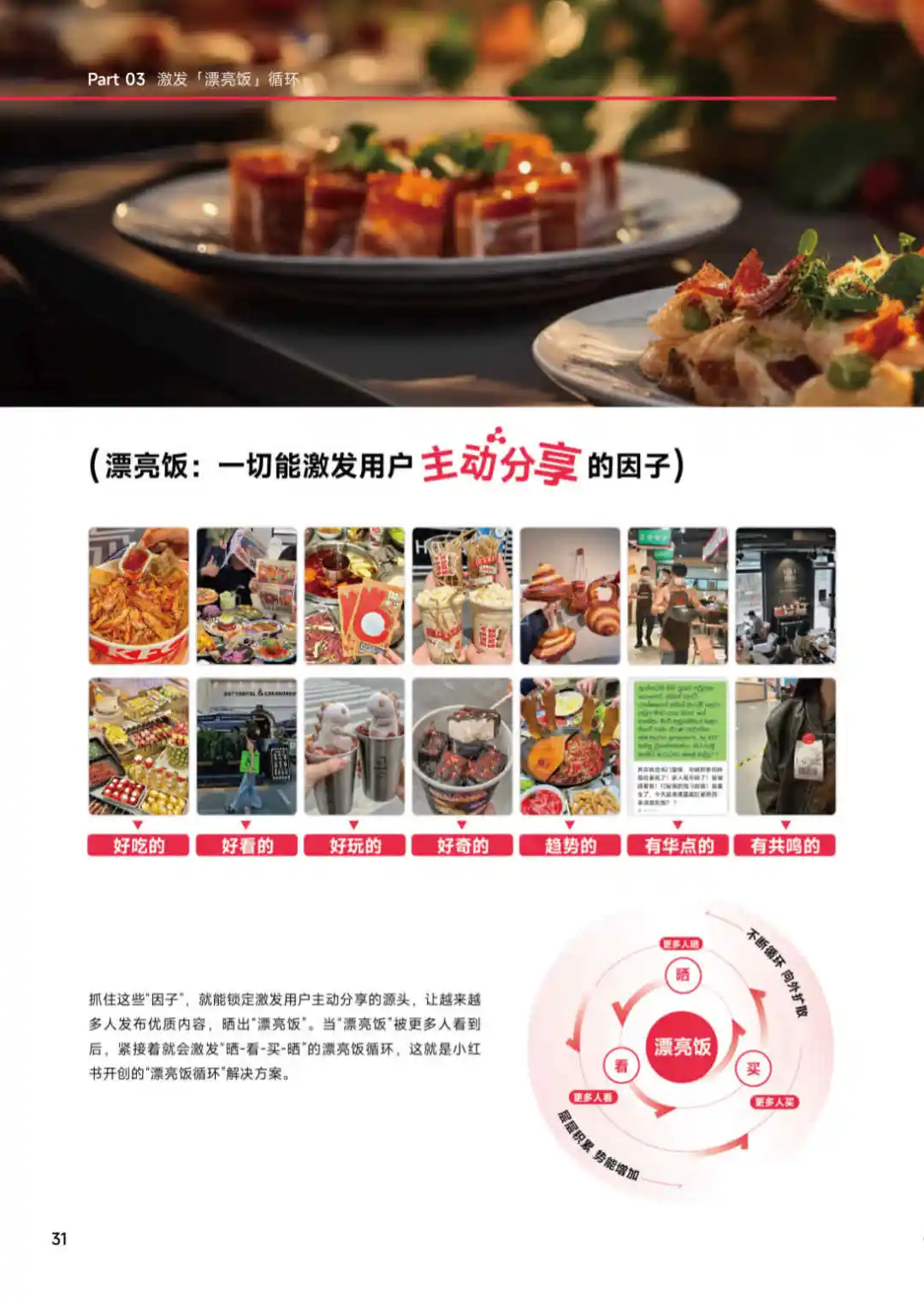 小红书提出的漂亮饭循环概念,强调的是一种全新的餐饮消费模式。在这里,漂亮饭不仅仅是指颜值高的美食,更包括所有能激发分享欲的美食。这个循环以晒为起点,通过用户的购买和分享,引发新的晒,形成晒,看,买,晒的连续式、循环式效应,为品牌带来高声量和好生意。