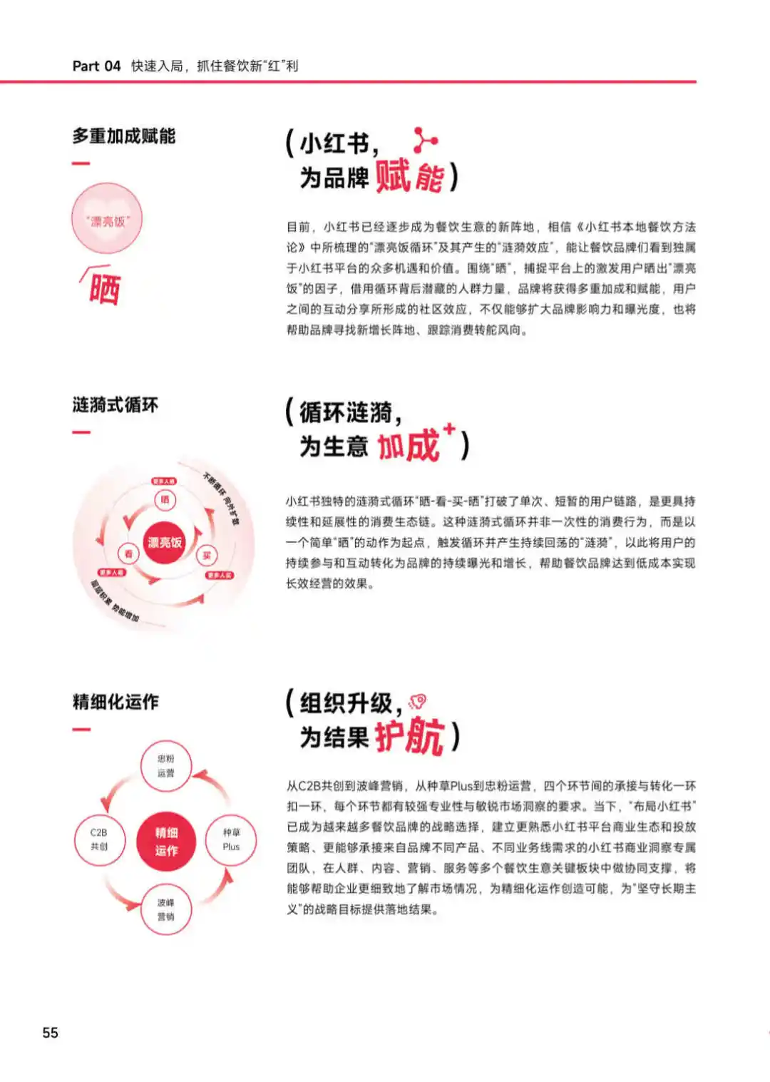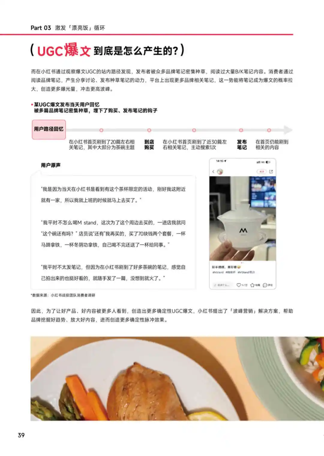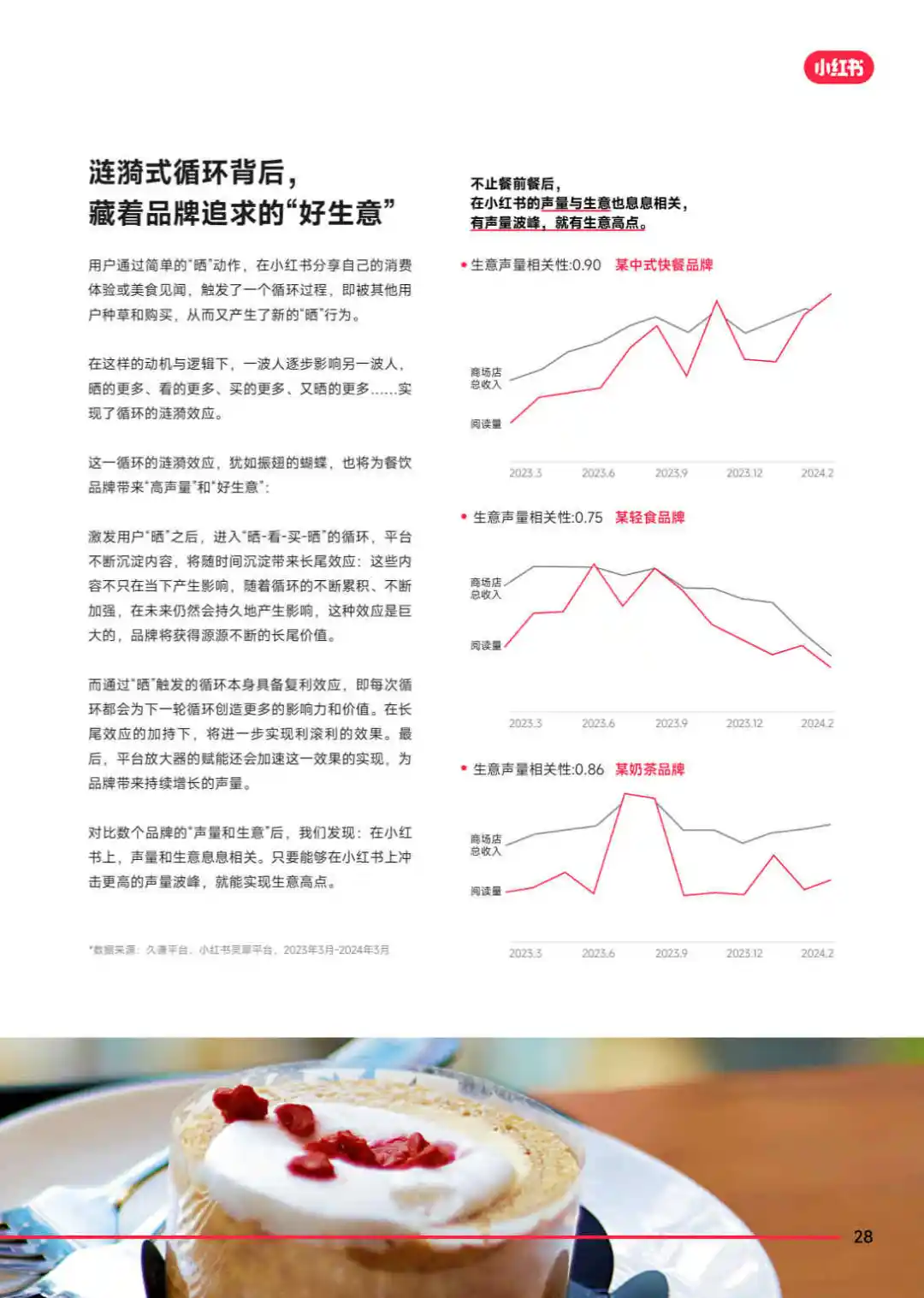 小红书提出的漂亮饭循环概念,强调的是一种全新的餐饮消费模式。在这里,漂亮饭不仅仅是指颜值高的美食,更包括所有能激发分享欲的美食。这个循环以晒为起点,通过用户的购买和分享,引发新的晒,形成晒,看,买,晒的连续式、循环式效应,为品牌带来高声量和好生意。
