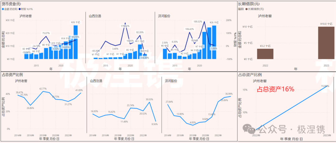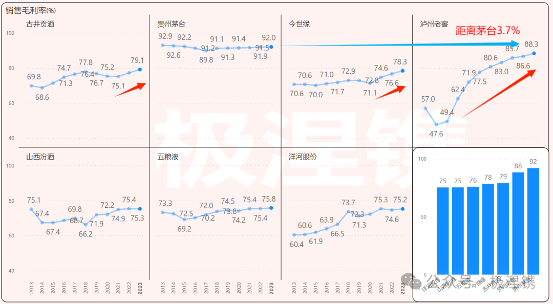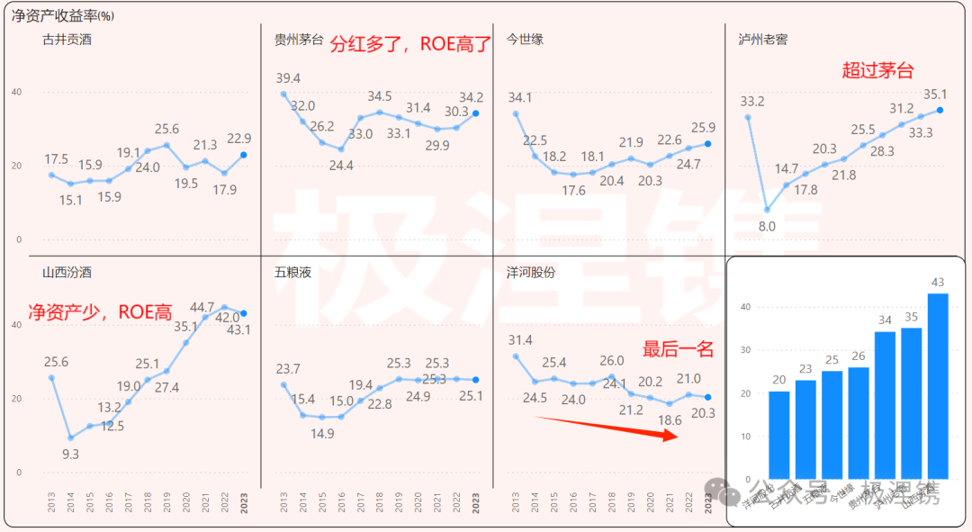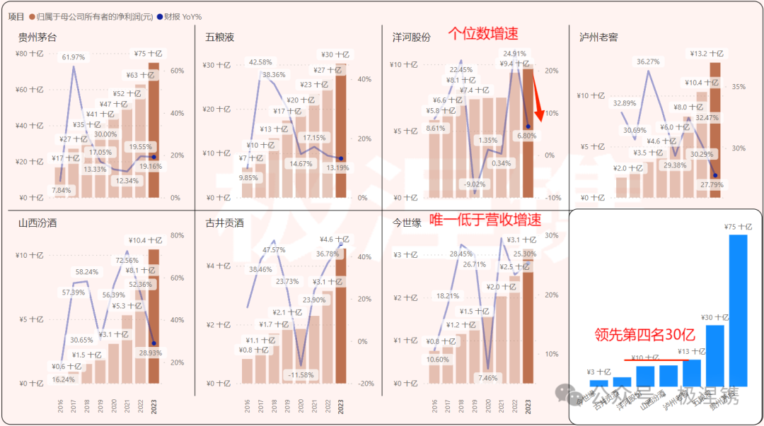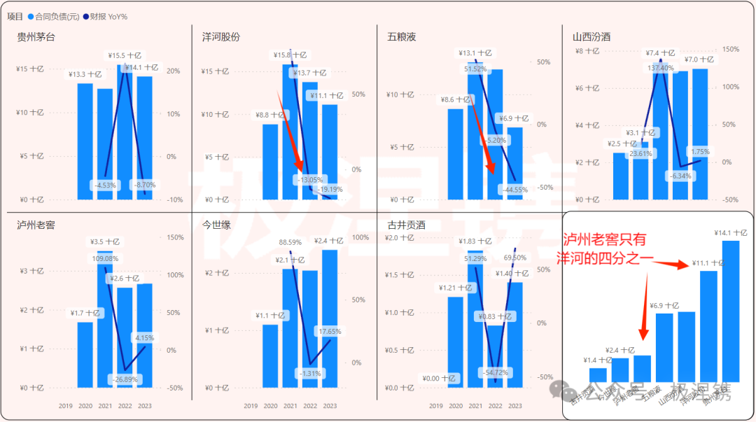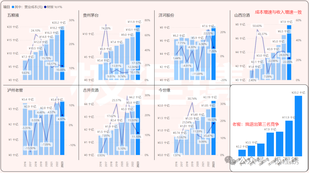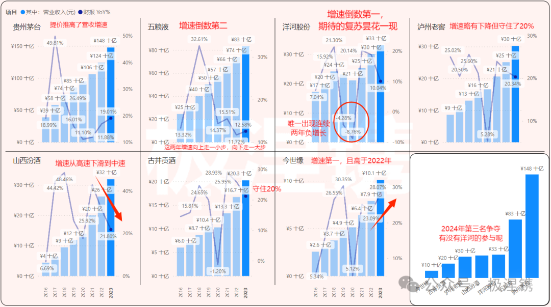 营业收入就是公司从事主营业务或其他业务所获得的收入。白酒七巨头的主营业务都是酒类或白酒。下图就是七巨头近几年营业收入的表现,右下角是2023年七巨头营业收入排行榜。泸州老窖和山西汾酒的保持高增速,到2023年,他们两的营收几乎与失速的洋河平起平坐。 今世缘去年营收达到101亿,虽然是七巨头中最低的,但是28%的增速是最高的。且增速超过2022年的23%。贵州茅台收入几乎等于后面三家追赶着营收的总和,达到了1480亿元,而且增速连续两年上升达到了19%。五粮液的增速在最近四年类似N型走势,先下一个台阶,然后第二年略有起色。由于体量达到830亿,是第三名的两倍多,且产品定价权受到茅台的压制,能有这样的增速,实属不易。经过2019-2020的阵痛后,大家都想洋河能好好的大显身手一番,没想到营收增长只是昙花一现,2023年的营收达到330亿,增速勉强达到10%,保住了第三的位置。白酒企业的成本50-55%是原材料,30-35%来自人工。白酒公司的成本增速普遍低于收入增速,除了汾酒成本22%的增速略高于21.8%的增速。 把营业成本排个名次还挺有趣,贵州茅台变第二,泸州老窖成倒数第二,其他公司的顺序和营收排序一致。这就导致毛利率的排名出现了变化。虽然没有分析过所有行业,但要说行业头部七大公司的毛利率都在75%以上,我还真想不出除了白酒还会有什么行业。 泸州老窖的神话还在继续,连续十年保持增长。从2014年47.6%七巨头垫底的毛利率,一举攀升至第二名,离茅台只有不到4%的差距。销售费用就是企业在销售产品或提供服务的过程中,为了卖出去更多的东西,而花费的各种开销和费用!销售费用在企业的运营中很重要,因为它直接关系到企业能不能把东西卖出去,赚到更多的钱。但是企业也要注意控制销售费用,不要花太多钱在销售上,导致赚不到钱。 消费已是宏观经济中不多的亮点,但仍旧复苏乏力,白酒企业也日渐焦虑,感觉日常能接触到的白酒广告也越来越多。有五家白酒企业的销售费用创出历史新高。分别是五粮液,古井贡酒,洋河,茅台和今世缘。比较苏酒双雄的销售费用,洋河近三年的增幅分别有39%,18%和29%。今世缘近三年增幅分别有11%,44%和51%。今世缘砸钱的效果带来的营收增幅比洋河高不少。今世缘花了1元,获得4.8元收入,挣到1.48元净利润,洋河花了1元,获得6.1元收入,挣到1.74的净利润,规模效应还是能给洋河带来一些优势。有趣的是与洋河争夺第三名的汾酒和泸州老窖在销售费用上排名倒数第二和三,且分别是增长-5.5%和15.2%。反观自带流量的茅台销售费用支出不多,但比前一年增长41%看出了茅台的一丝焦虑。汾酒和老窖怎么做到那么淡定呢?泸州老窖的大存大贷引起了激烈的讨论。其他同行几乎没有长期借款。那我们就简单地把争夺第三名的热门候选人进行比较。 汾酒货币资金充裕,2023年货币资金骤减是因为公司以定期存款方式进行日常资金管理。因理财产品出现亏损遭人诟病后,洋河就开始以现金为王了,现在手握260亿元。三家公司的货币资金算上拿去存款或理财的钱,通常能占总资产的30-45%。极涅镌君也非常疑惑在2023年,泸州老窖账上的钱多了80亿,借款多了68亿。这是怎样高超的财技呢?净利润就是企业赚了钱之后,去掉所有开销和税费,最后剩下的那部分钱。也就是说,它是企业真正赚到的、可以自由支配的钱。净利润的计算公式是:净利润 = 利润总额 - 所得税费用。对于企业来说,净利润很重要!它就像是一个企业的“成绩单”,反映了企业运营的效果和赚钱的能力。净利润越多,说明企业运营得越好,赚钱能力也越强。 洋河因为2023Q4 淡季收入低,叠加费用预提、预缴消费税与附加税,导致净利润增速低于营收降至个位数,只增长了6.8%。另一家净利润增速低于营收增速的是今世缘,相较于28%的营收增速,较高的费用支出让净利润增速降至25.3%。较低的成本和费用支出让泸州老窖在净利润的排名中站稳第三名。净利率就是企业赚了多少钱之后,再减去各种成本和税费,最后剩下的钱和它的总收入相比,得到的比例。这个比例越高,就说明企业赚钱的能力越强。简单来说,就是企业用每一块钱的收入,最后能赚到多少钱的比例。 古井贡酒的成本和费用支出较高,和其他企业差距较大。拥有高端酒的三家企业销售净利率较高。合同负债,就是指企业已经收到或者应该收到的客户支付的款项,但还没完成合同中规定的商品或服务的转让义务。比如,你预定了一家餐厅的年夜饭,并且提前支付了费用,但年夜饭还没吃,那么这家餐厅在财报上就会把你这笔钱记作合同负债。因为餐厅虽然收到了钱,但还没有为你提供年夜饭这项服务,所以还不能算作收入,只能算是负债。 合同负债看总额,第二是洋河,泸州老窖不到洋河的四分之一,可能公司策略不同。看增速,洋河和五粮液合同负债下降非常明显,同时他们营收增速也是比较低的。ROE即净资产收益率,就是用来衡量公司赚钱能力的一个指标。简单来说,就是公司用股东们的钱(净资产)赚了多少钱的比例。具体来说,净资产收益率 = 公司的净利润 ÷ 公司的净资产。如果净资产收益率高,就说明公司用股东的钱赚得比较多,是个好公司。 汾酒,泸州老窖ROE比茅台高,营收和利润增速也高于茅台。汾酒在业绩高速增长的情况下ROE下降主要是作为分母的净资产增长更快。洋河ROE放其他行业绝对亮眼,但是在白