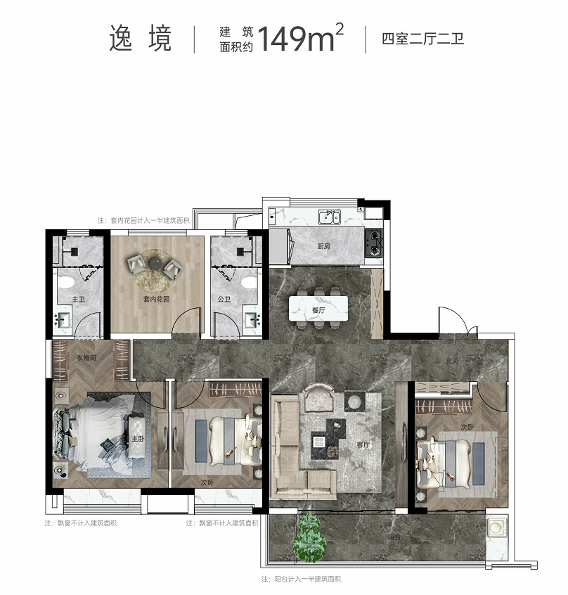 套房主卧设计,步入式独立衣帽间、独立卫浴、宽景大飘窗,赠予生活更多的精致感与仪式感!