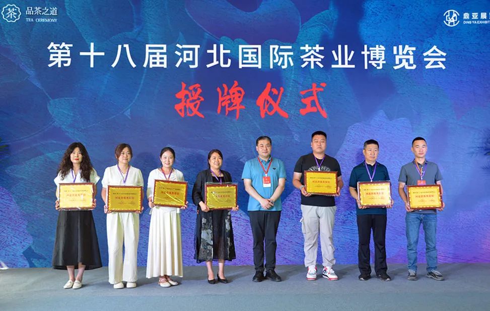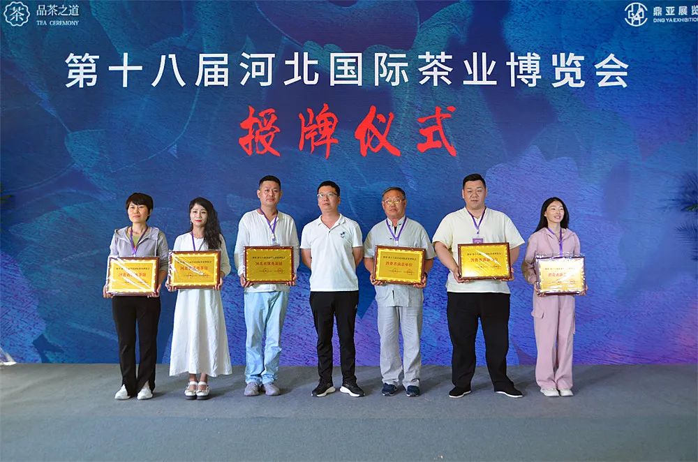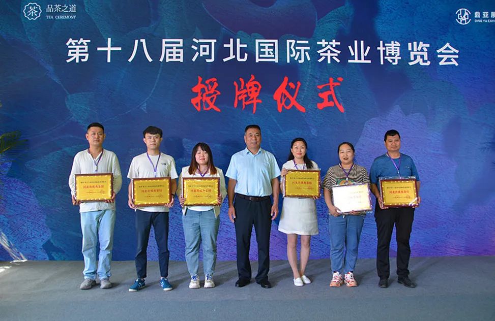 河北省茶叶流通协会副会长兼秘书长王志(右四)为获奖单位授牌后合影留念