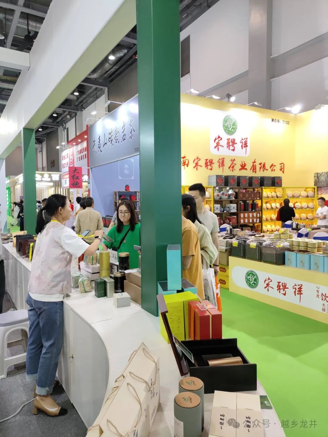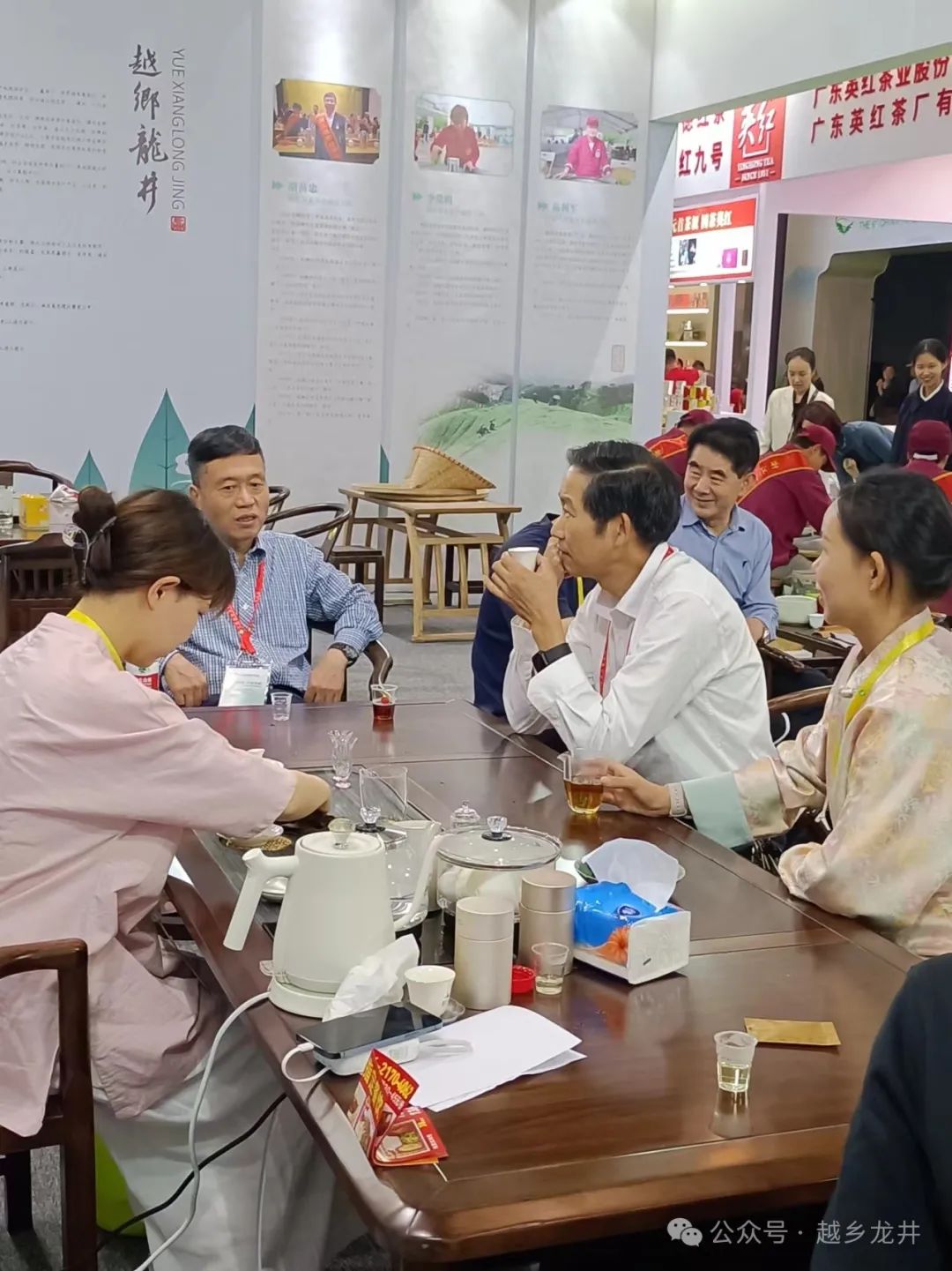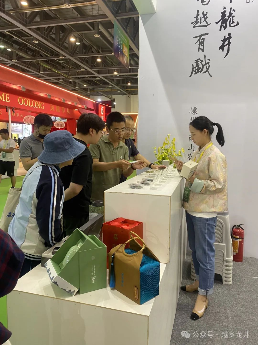 今天是第六届中国国际茶叶博览会开幕第一天,嵊州越乡龙井展馆人气还是挺旺的。