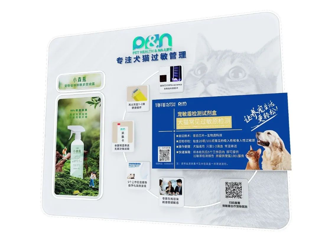 本次展位特别打造【专注犬猫过敏管理】专区,全面呈现「华驰千盛犬猫20项/101常见过敏原检测产品」,以及新品「小森瓶宠物祛味抗敏多效喷雾」,从过敏检测到后期管理,全链路提供犬猫过敏的解决方法。