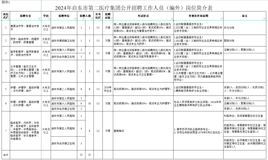 详见《2024年启东市第二医疗集团公开招聘工作人员(编外)岗位简介表》(附件1, 下称《岗位简介表》)。