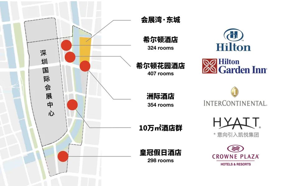 深圳国际会展中心规划约25万㎡会展星级酒店群。在展馆1公里范围内,已确定引进希尔顿酒店、洲际酒店、皇冠假日酒店、希尔顿花园酒店等3家五星级、1家四星级酒店,未来将成为全球星级酒店密度最高的区域之一,为全球商务精英、会展商旅人士、塔尖圈层,带来媲美世界标准的酒店商旅体验,打造商务下榻、旅游出行、接待宾客的新名片。