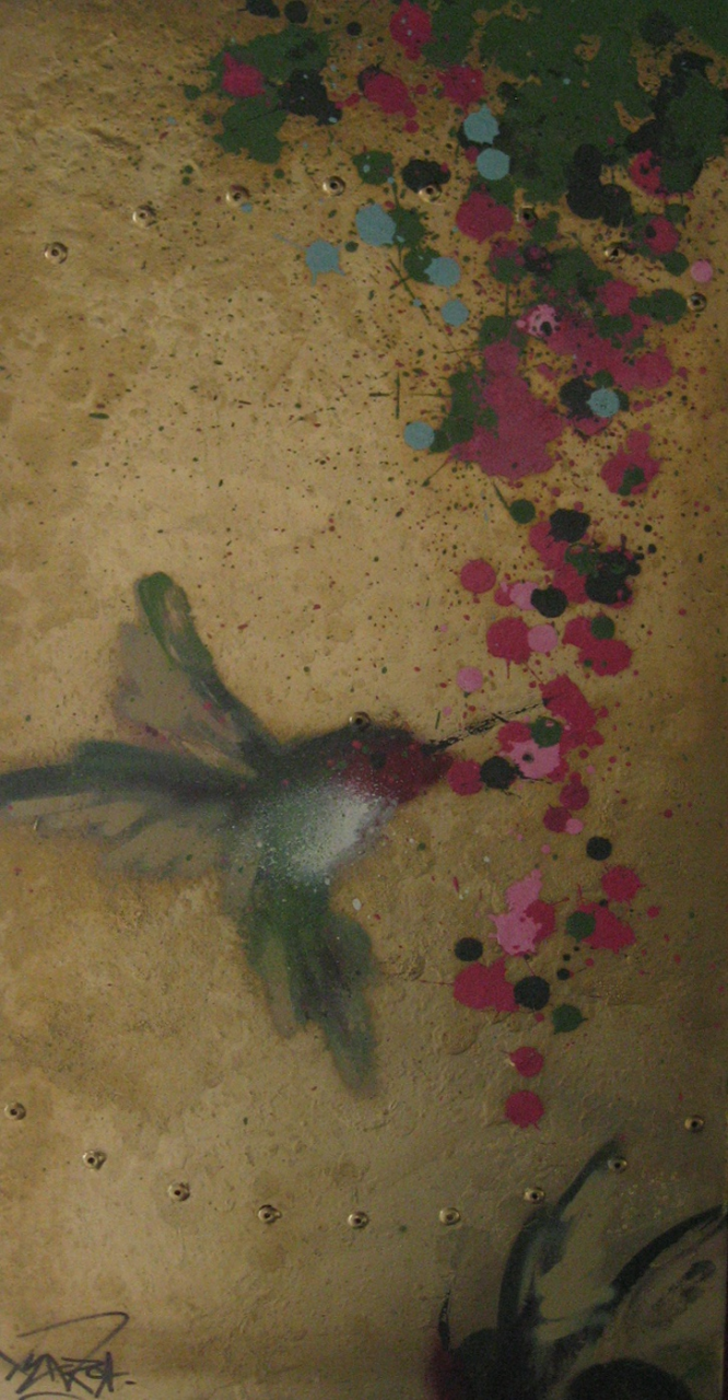 His experience as a street artist informs his work in the studio. He is a multi disciplinary visual artist. Xenz paintings often explore ethereal themes with enchanted forests depicting birds, butterflies and flowers. He draws inspiration from many sources. Japanese block prints, Chinese watercolours and the paintings of the Impressionists high on this list. Occasionally he breaks from these ethereal themes to depict the world that surrounds him, one of urban detritus and life in the city. Lately he has been working in digital formats creating 3d models, films, sound scapes and projections including recent experiments in virtual reality experiences.