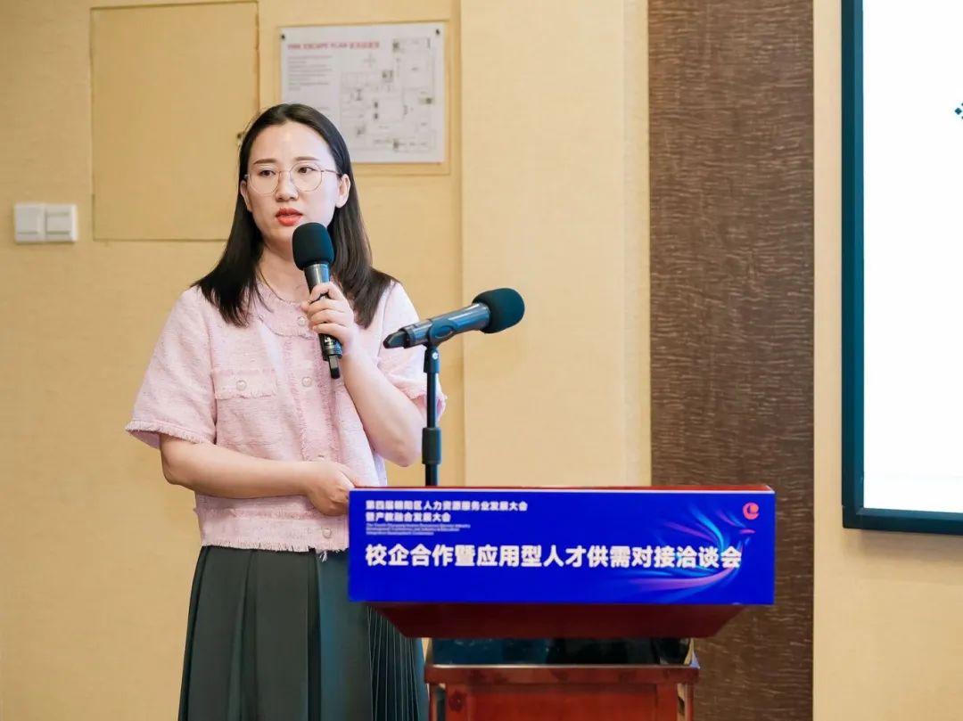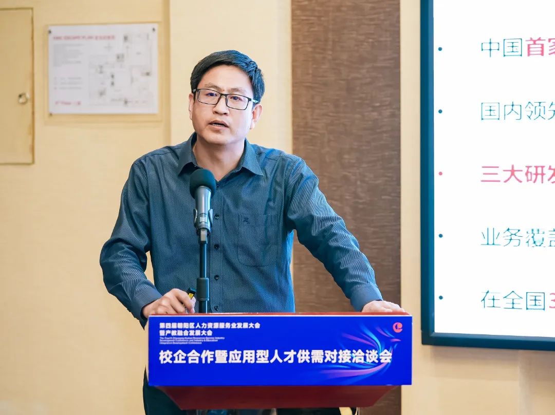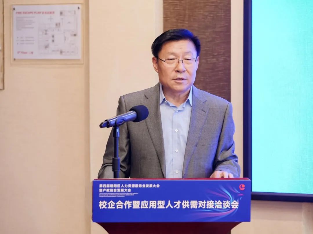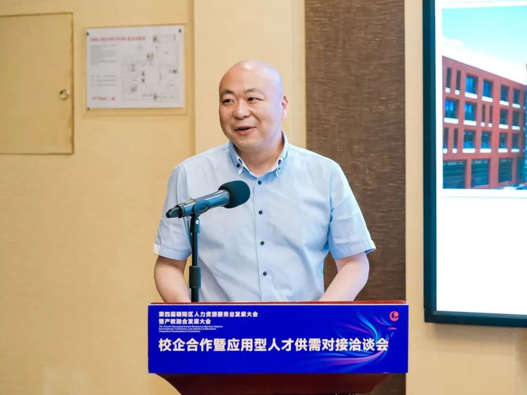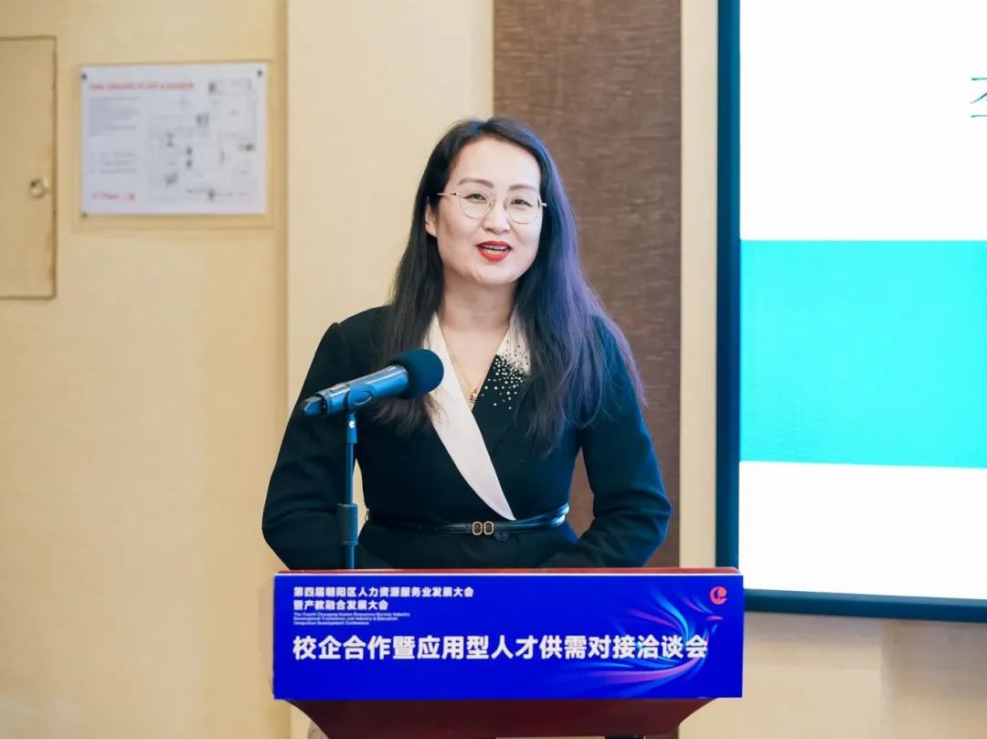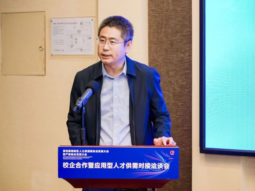 北京市朝阳区人力资源服务促进会秘书长刘晓波代表主办方致辞,他指出校企合作是推动院校教育与社会需求紧密对接的重要途径,也是培养高素质应用型人才的有效方式,对于促进教育链、人才链与产业链、创新链的有机衔接,具有十分重要的意义;朝阳区人力资源服务促进会将发挥出朝阳区人力资源服务产业集聚效应和优势,不断提升服务、扩大开放、促进合作,推动高校人才培养与就业有机联动、人才供需有效对接,拓宽毕业生就业渠道、促进毕业生高质量就业。