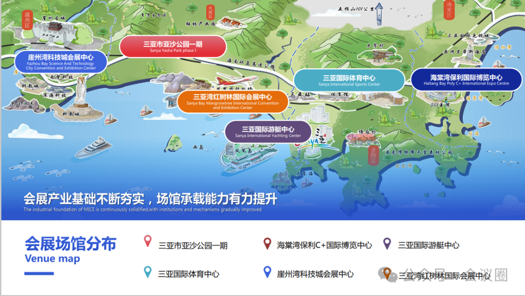 随着专业化会展场馆和文体场馆的陆续建成、投用,三亚基本形成“一主要湾区一会展中心”的会展场馆空间布局。海棠湾保利国际博览中心地处海棠湾“国家海岸”的新城核心地带,是海南省的名片项目,2023年已经投用。