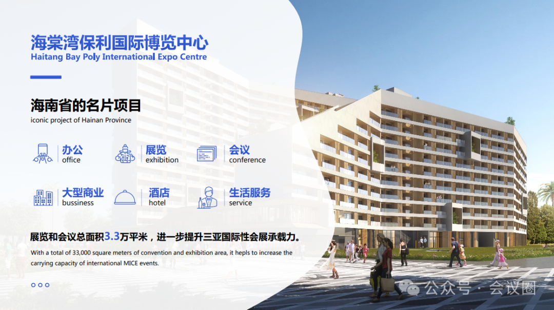 项目以保利国际博览中心为主体,是集办公、展览、会议与大型商业、酒店、生活服务于一体的会展综合体。展览和会议总面积3.3万平米,其中室内展览展示净面积1.5万平米,室外用于展览展示的面积1.5万平米,项目建成后进一步提升三亚会展的承载力。