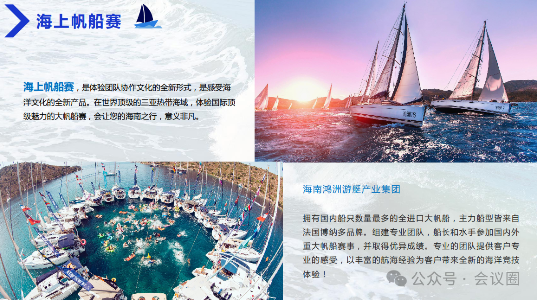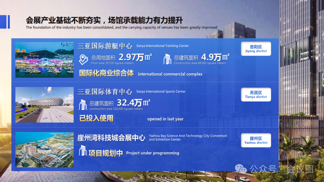 三亚国际游艇中心是对标世界游艇产业最高水平开放形态所打造的集游艇与周边产品展示、交易、服务、培训、文化、艺术等诸多业态为一体的国际化商业综合体。项目呈现以游艇为支撑的主题特色风貌。总建筑面积4.9万平米,共由三个场馆组成。1号和2号楼一层共有7200平米专业室内展示中心,2023年成功举办三亚国际游艇展暨国际酒类展。三亚国际体育中心主场馆白鹭体育场也投入使用,举办了多场演唱会,满足市内各类大型会议、节庆和赛事等的需求。崖州湾科技城会展中心项目正在规划中,项目将服务种业、深海等领域专业展会,面向国际承接更多国际专业会议和精品展会。