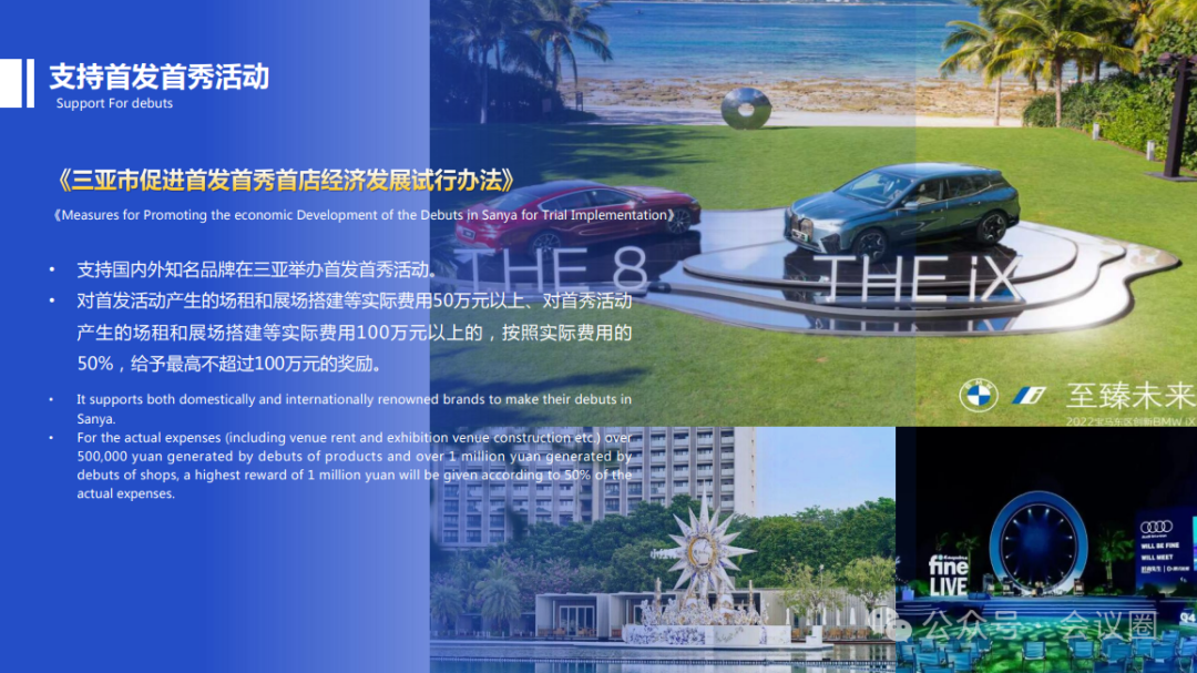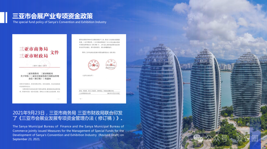 2018年三亚就出台了会展业资金支持政策,办法实施了三年。为更加贴合产业发展实际,2021年9月23日,三亚市商务局 三亚市财政局联合印发了《三亚市会展业发展专项资金管理办法(修订稿)》,办法旨在培育和引进一批知名度高、影响力大的重点会展品牌,吸引国际会展组织和知名会展机构落户三亚。