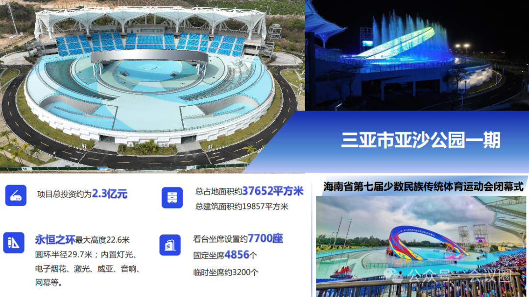 三亚市亚沙公园一期项目位于三亚市天涯区马岭街,一层建筑面积15399平方米,二层建筑面积为4253平方米,看台座席设置约7700座,其中固定坐席约4500个,临时坐席约3200个,成功举办海南省第七届民族运动会闭幕式。